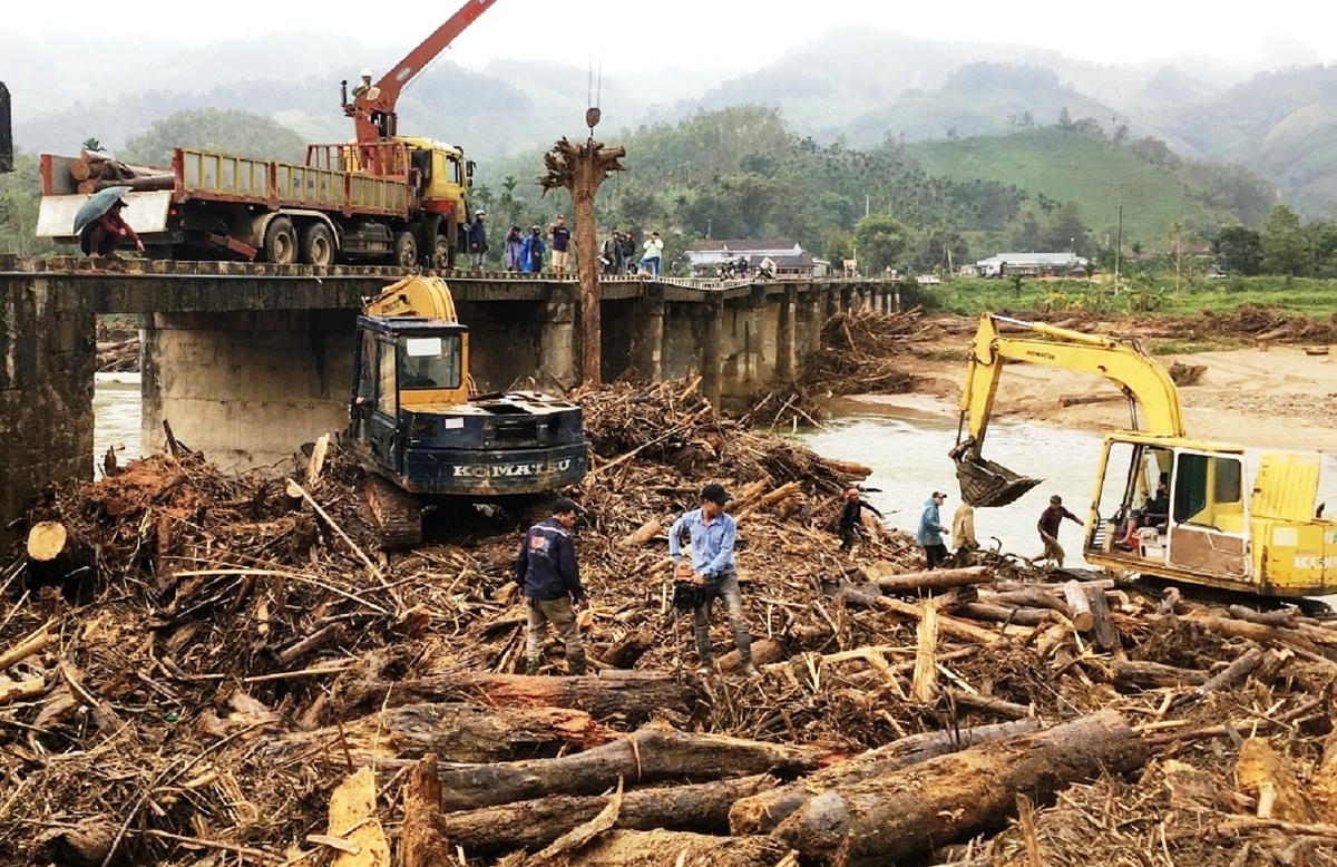 Cùng với người dân nhiều công nhân Chi cục Đường bộ 3 cũng tham gia trục vớt gỗ để khơi thông dòng chảy, đảm bảo việc thoát lũ cũng như bảo vệ cây cầu. Các phương tiện máy móc cũng được huy động để vớt gỗ.