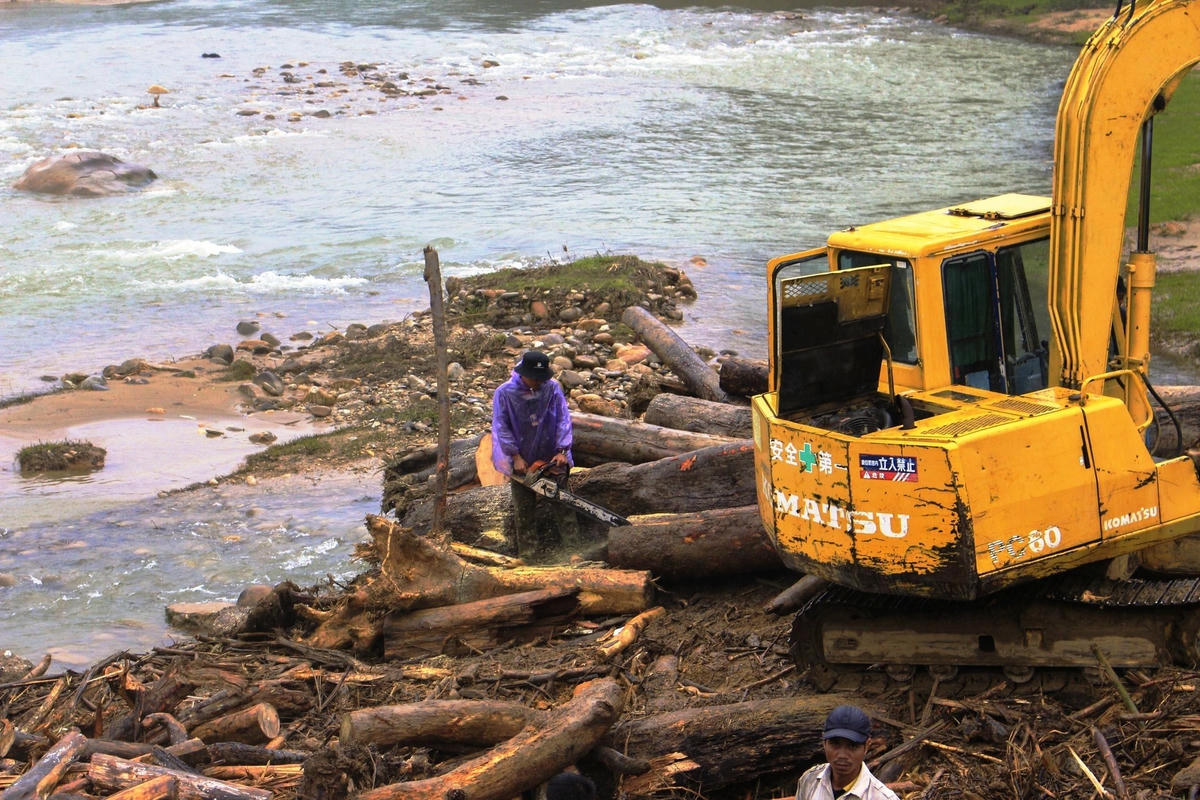 Chúng tôi nhận thấy, nhiều cây gỗ rừng có đường kính từ 40-50 cm, dài hơn 8 m đổ về nằm ngổn ngang ở các cồn cát, theo dọc theo sông Bua và bủa vây dưới chân cầu, còn người dân thì đua nhau trục vớt gỗ.