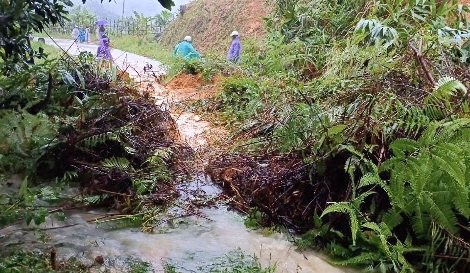 Tương tự, tại một số huyện miền núi Ba Tơ, Sơn Tây, tỉnh Quảng Ngãi, mưa lớn cũng đã gây sạt lở nhiều nơi, nhiều tuyến đường bị chia cắt. Hiện chính quyền địa phương đã chỉ đạo cho lực lượng chức năng tiếp tục theo dõi, để kịp thời triển khai các biện pháp di dời dân tại các khu vực nguy hiểm, đến nơi an toàn. Còn ở địa bàn huyện Sơn Tây, một điểm núi Bảy Màu, xã Sơn Tân đã bị sạt lở khoảng 50m3, khiến đất đá trôi ra đường, gây ách tắc giao thông. Ngay sau khi xảy ra sạt lở, lãnh đạo xã Sơn Tân đã có mặt tại hiện trường chỉ đạo cán bộ xã, đoàn viên, thanh niên cùng với người dân khẩn trương dọn dẹp đất đá, đảm bảo đi lại, sinh hoạt của nhân dân và đảm bảo an toàn giao thông, đồng thời cắm biển báo nguy hiểm tại khu vực xảy ra sạt lở.