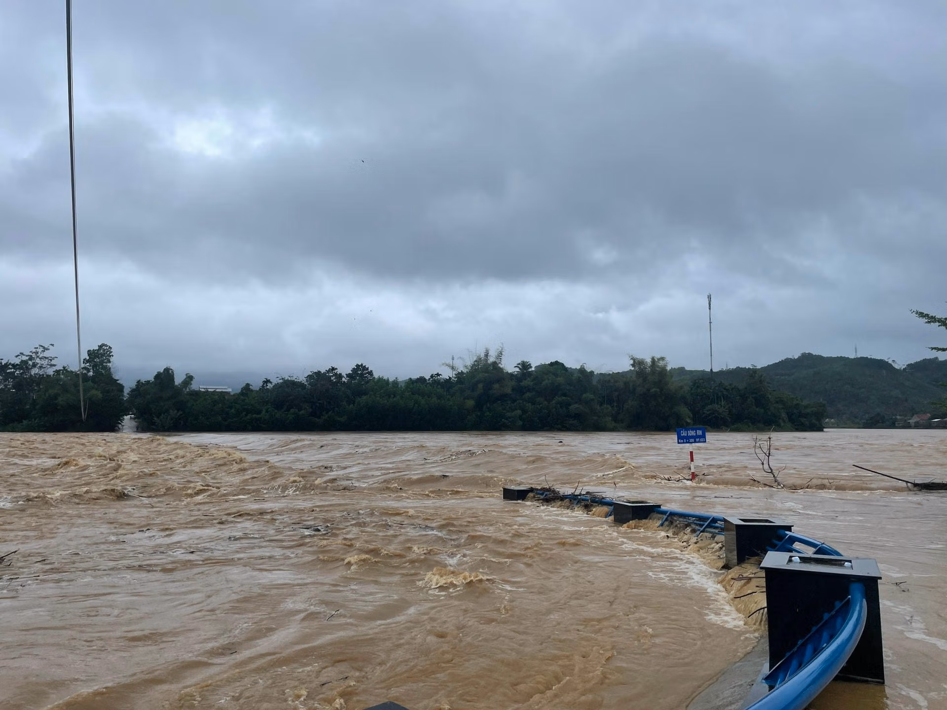 Ông Trần Thanh Trung, Phó Chủ tịch UBND huyện Sơn Hà, tỉnh Quảng Ngãi cho biết, mưa lớn kéo dài từ đêm 13 đến sáng 14/11, nước từ thượng nguồn đổ về khiến nhiều điểm cầu tràn ngập sâu, chia cắt. Hiện tại cầu Sông Rin trên quốc lộ 24B, nối một số huyện ở khu vực phía Đông - Tây của tỉnh, nước đã tràn qua và ngập sâu gần cả mét.