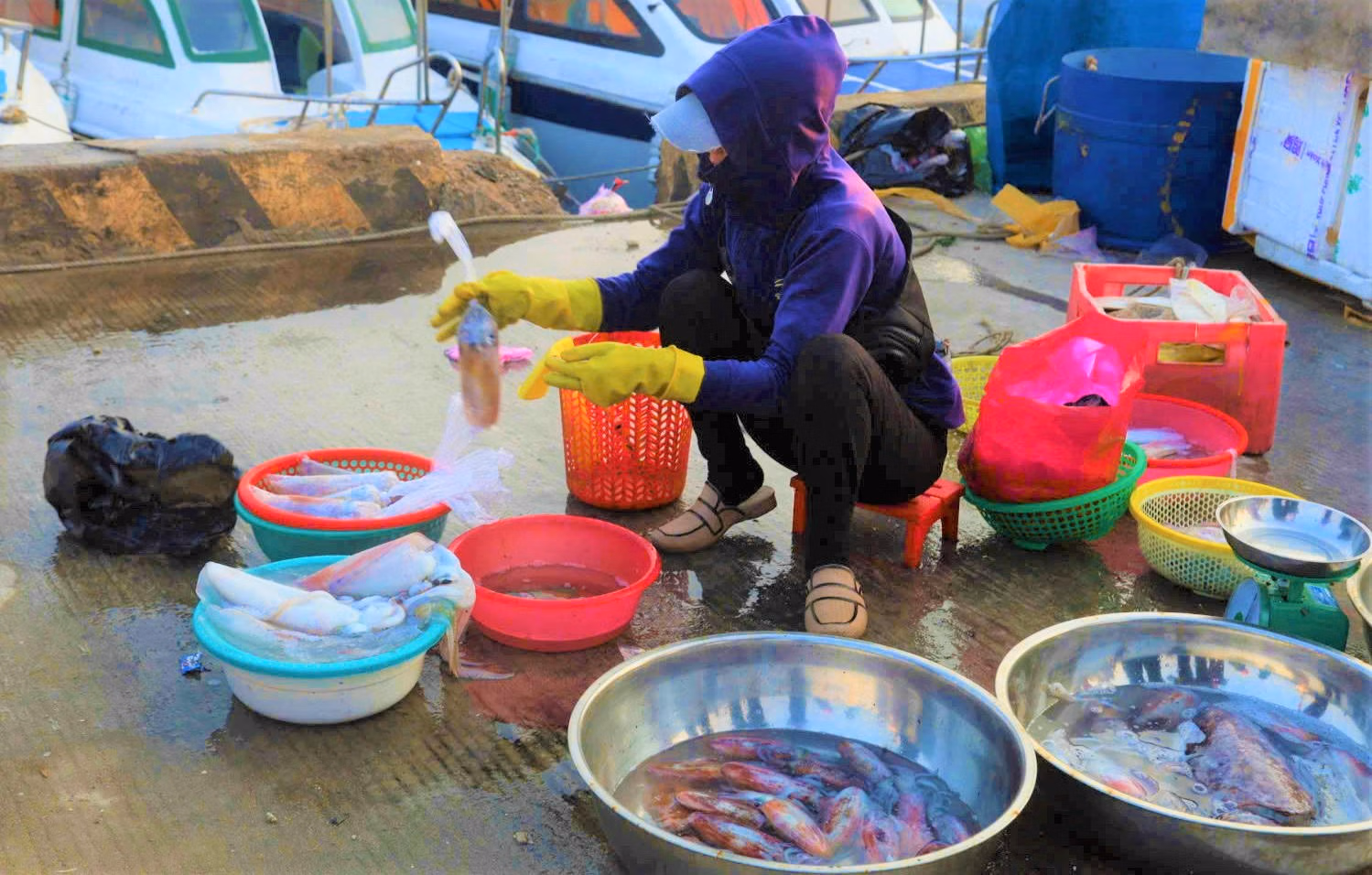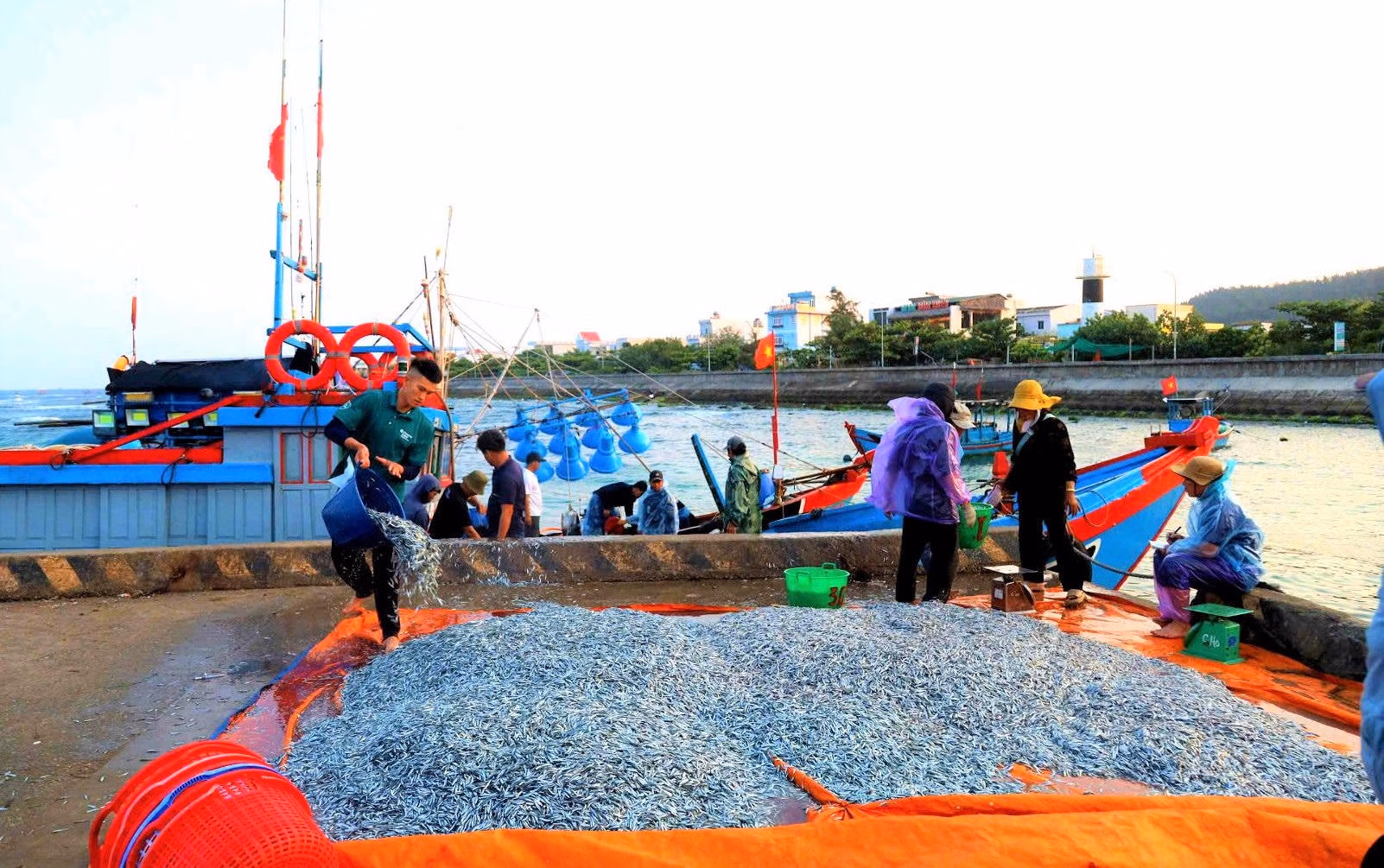 Dọc bến cảng, hoạt động bốc dỡ diễn ra khẩn trương. Những thùng cá, mực, tôm còn đẫm vị mặn của biển được chuyển lên bờ trong không khí tất bật nhưng đầy hứng khởi. Tiếng cười xen lẫn lời hỏi han tạo nên bức tranh sinh động của một làng chài vào mùa cá.