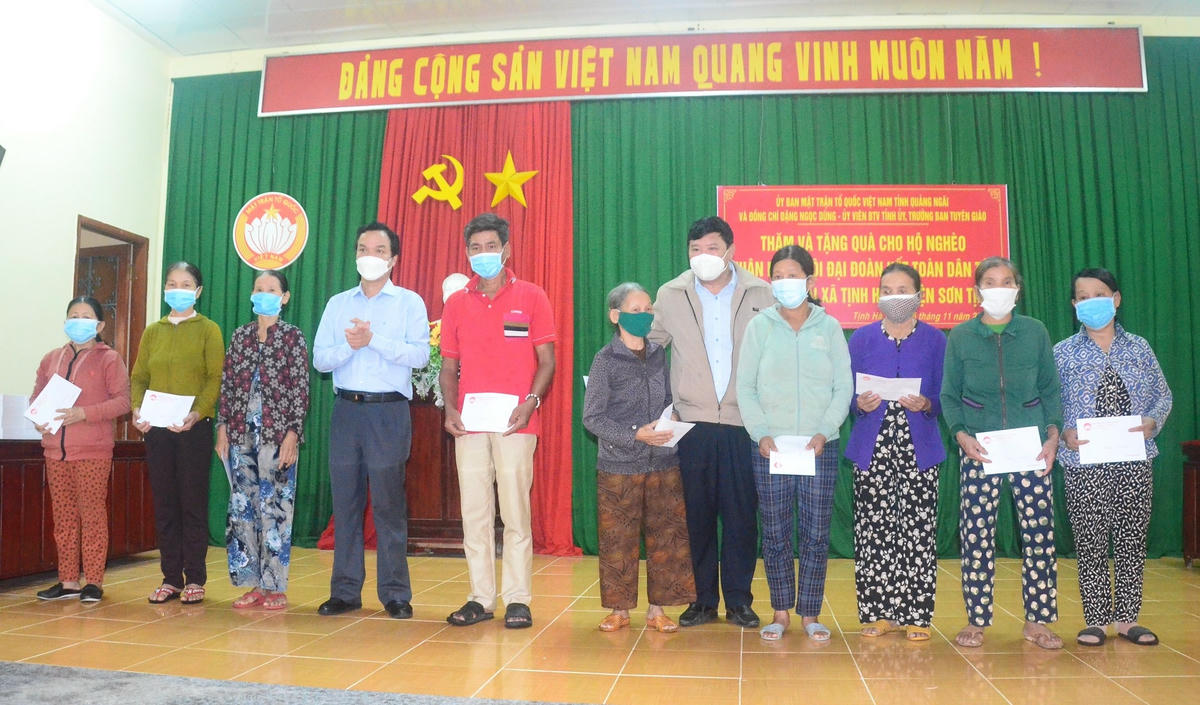 Sáng ngày 16/11, Ủy ban MTTQ Việt Nam tỉnh và ông Đặng Ngọc Dũng, Ủy viên Ban Thường vụ, Trưởng ban Tuyên giáo Tỉnh ủy đến thăm và tặng quà cho hộ nghèo nhân Ngày hội Đại đoàn kết toàn dân tộc năm 2021 tại xã Tịnh Hà, huyện Sơn Tịnh.