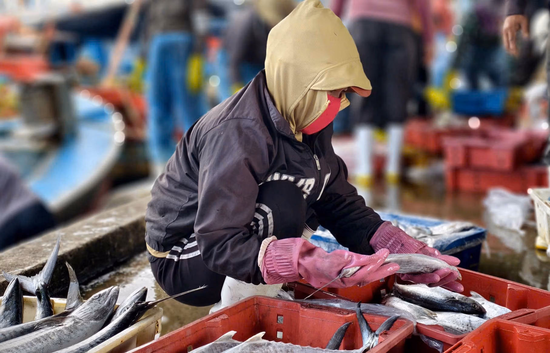 Cá về nhiều kéo theo nhu cầu lao động bốc xếp, phân loại tăng cao, với mức thu nhập 400.000 đến 500.000 đồng/ngày trong những ngày cao điểm.