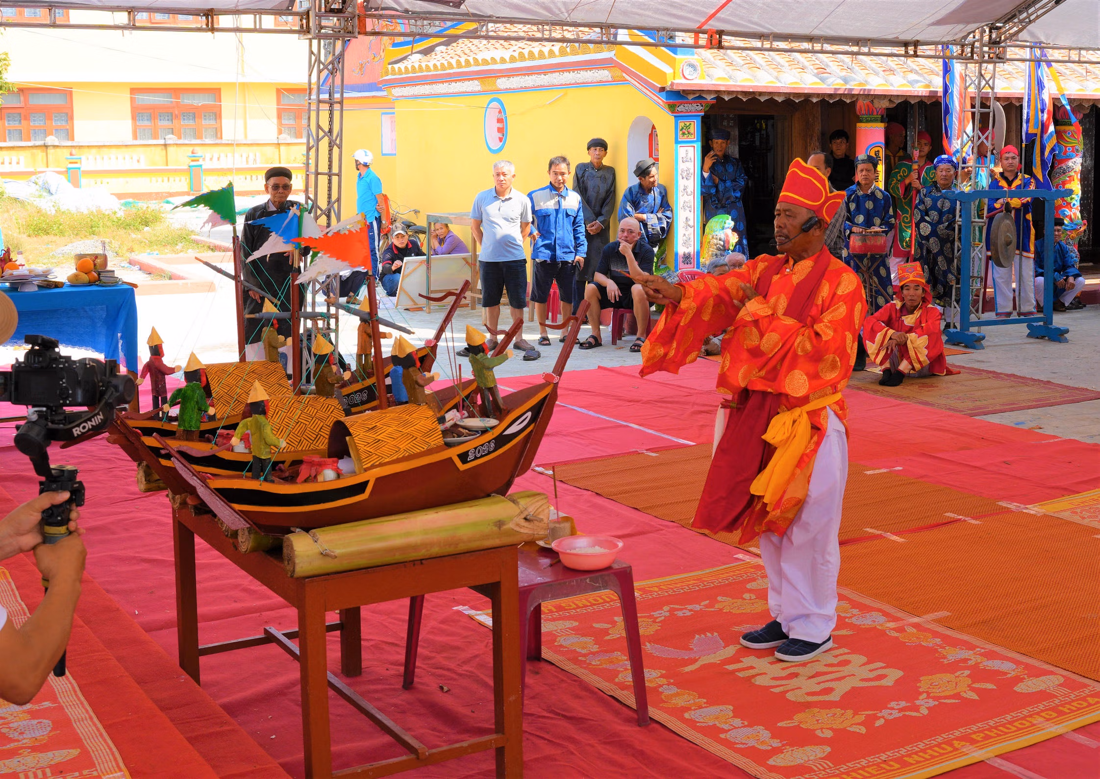 Sau phần tế lễ, tiếng trống và tiếng ốc u vang lên rộn rã, các trai tráng trong làng rước mô hình thuyền câu ra biển, tái hiện lễ tiễn đưa hùng binh Hoàng Sa Bắc Hải lên đường làm nhiệm vụ thiêng liêng.