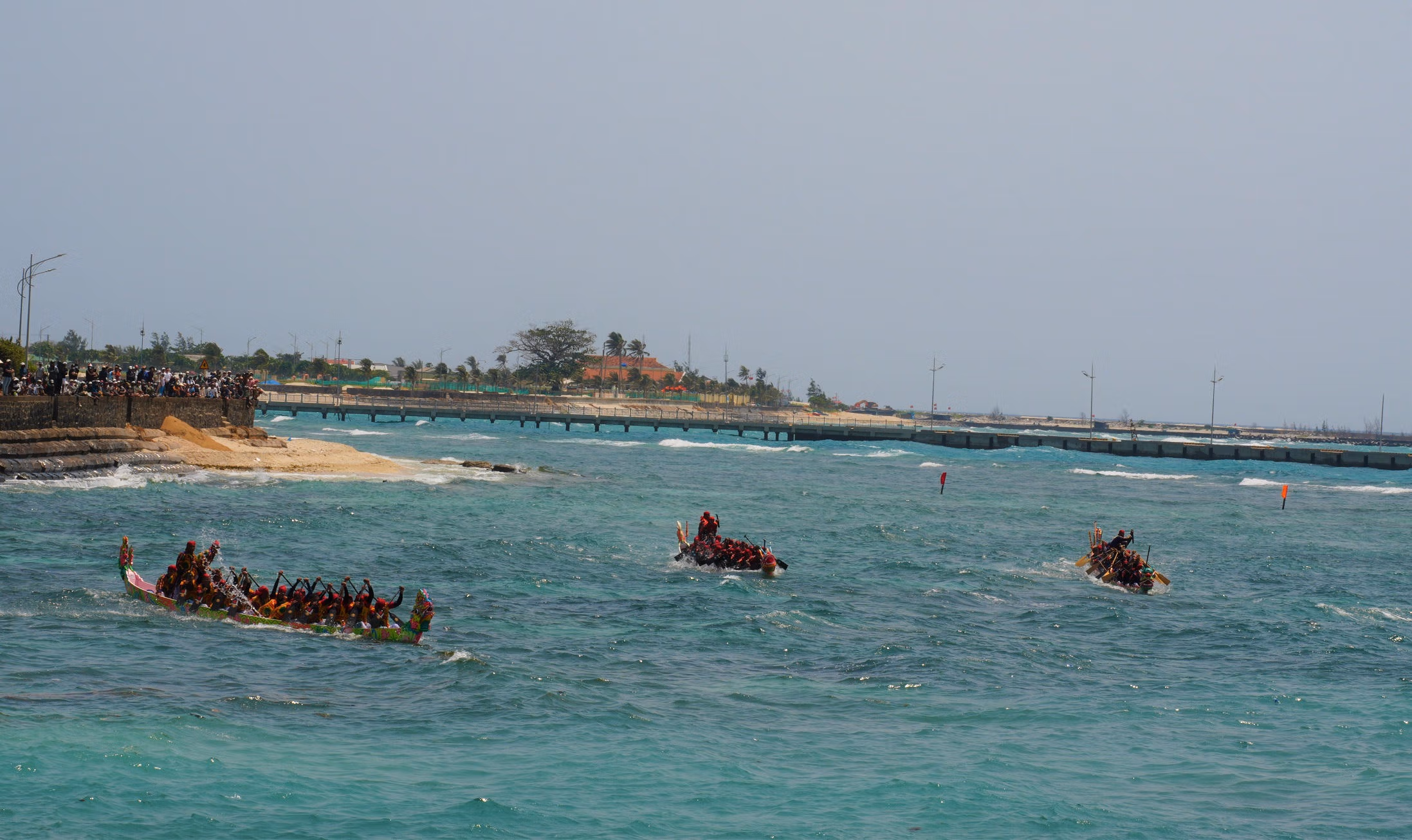 Ngay sau phần lễ, các đội đua thuyền mang biểu tượng Long, Lân, Quy, Phụng thi đấu quyết liệt trong tiếng cổ vũ hào hứng của người dân và du khách.