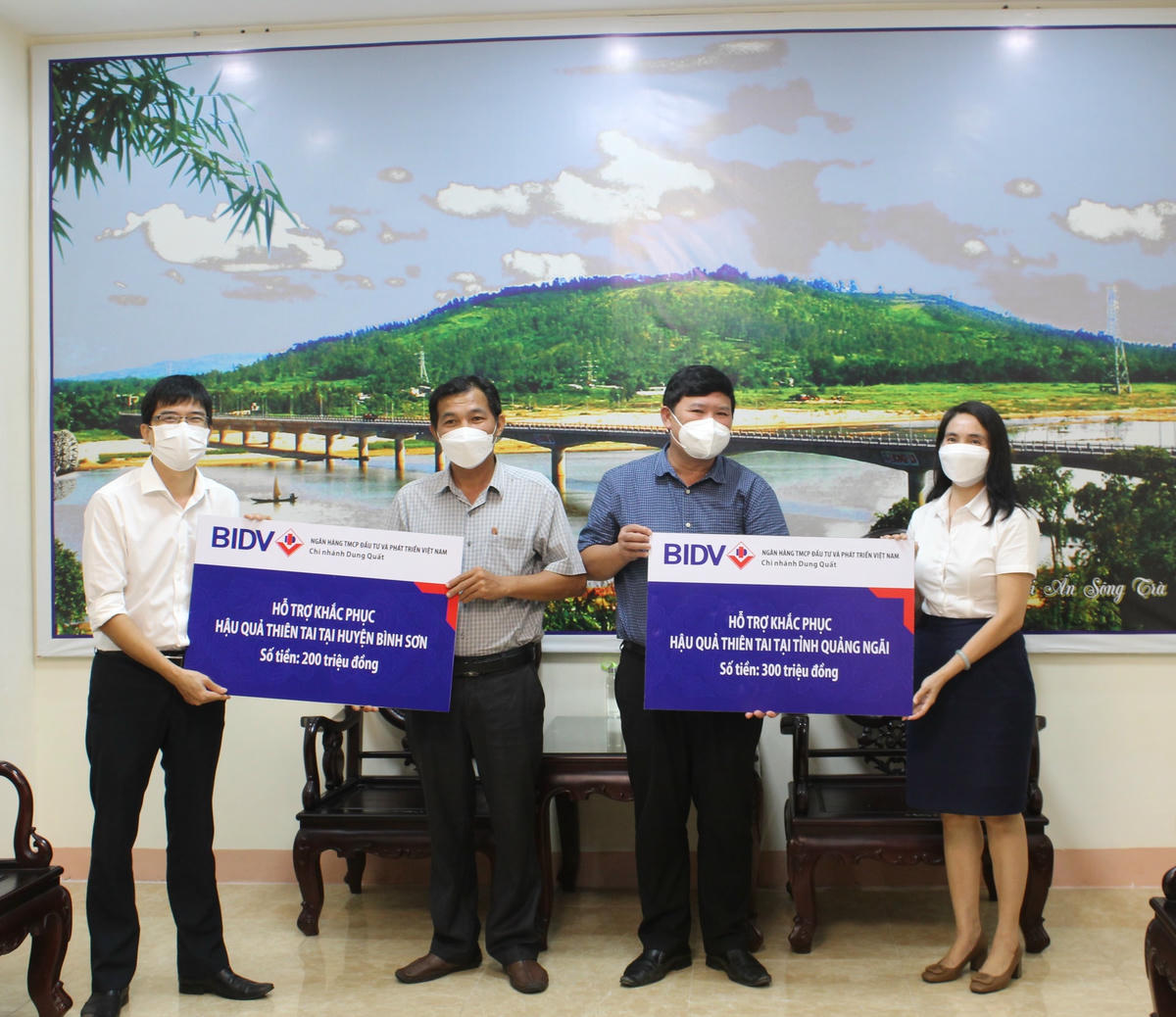 Theo đó, đại diện lãnh đạo Ngân hàng Thương mại Cổ phần Đầu tư và Phát triển Việt Nam – Chi nhánh Dung Quất (BIDV Dung Quất) đã trao tặng 500 triệu đồng hỗ trợ thiên tai tại tỉnh Quảng Ngãi. Trong đó, trao cho Ủy ban MTTQ Việt Nam tỉnh 300 triệu, Ủy ban MTTQ Việt Nam huyện Bình Sơn 200 triệu.