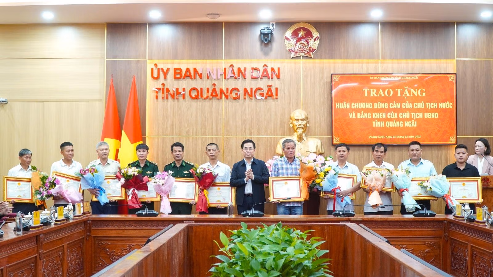 Tại buổi lễ, Sở Nội vụ công bố quyết định số 2360/QĐ-CTN ngày 9/12/2025 của Chủ tịch nước về việc tặng thưởng Huân chương Dũng cảm cho ông Phan Duy Quang và ông Lê Văn Sanh, cả 2 cùng ở đặc khu Lý Sơn, vì đã dũng cảm cứu người trong bão số 13; cùng các quyết định khen thưởng của Chủ tịch UBND tỉnh đối với các tập thể, cá nhân có thành tích tiêu biểu trong công tác cứu hộ, cứu nạn năm 2025.
