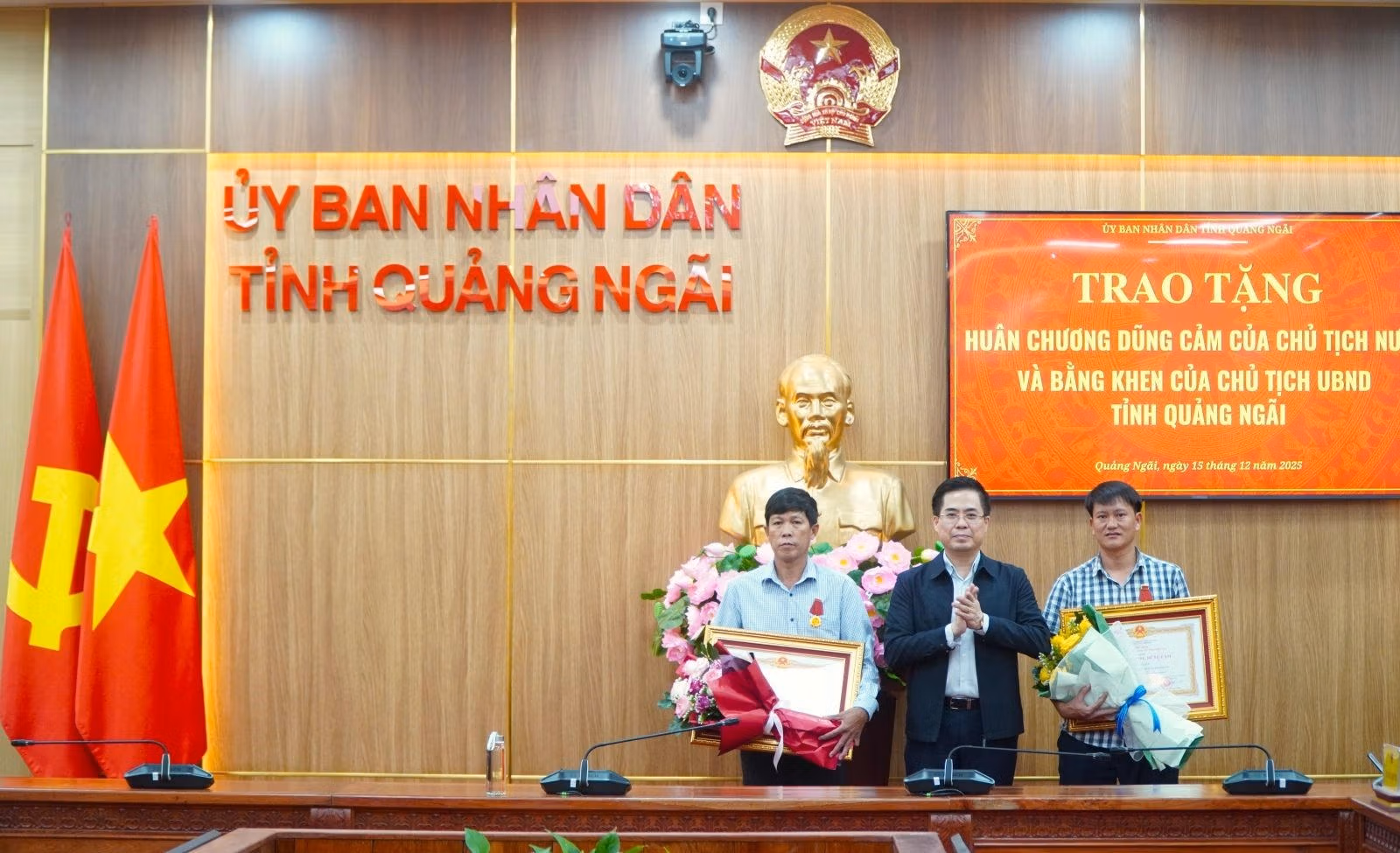 Chiều 15/12, thừa ủy quyền của Chủ tịch nước, Chủ tịch UBND tỉnh Quảng Ngãi Nguyễn Hoàng Giang đã trao Huân chương Dũng cảm cho 2 cá nhân có hành động dũng cảm cứu người trong bão số 13; đồng thời trao Bằng khen của Chủ tịch UBND tỉnh cho các tập thể, cá nhân có thành tích xuất sắc trong công tác cứu hộ, cứu nạn trong cơn bão này.