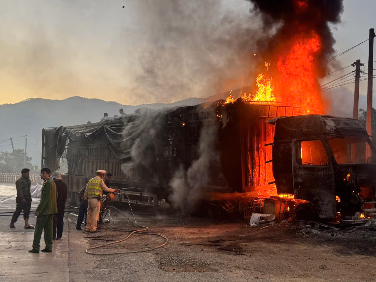 Tại hiện trường, ngọn lửa bùng phát mạnh, bao trùm phần đầu xe. Lực lượng CSGT cùng các đơn vị chức năng đã khẩn trương triển khai phương án chữa cháy, khống chế đám cháy và bảo đảm an toàn giao thông.