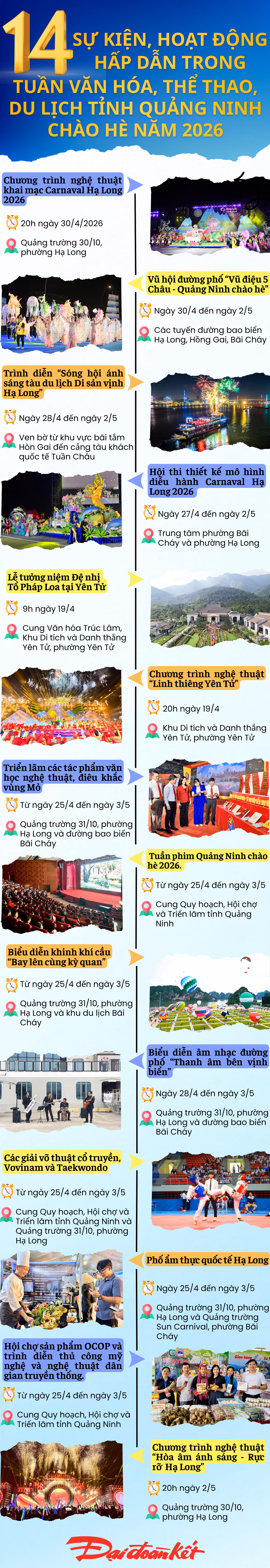 Tuần văn hóa, thể thao, du lịch tỉnh Quảng Ninh chào hè năm 2026 diễn ra từ ngày 25/4 - 3/5, với chuỗi 14 sự kiện, hoạt động hấp dẫn, dự kiến thu hút 1,3 triệu lượt khách đến với Quảng Ninh.