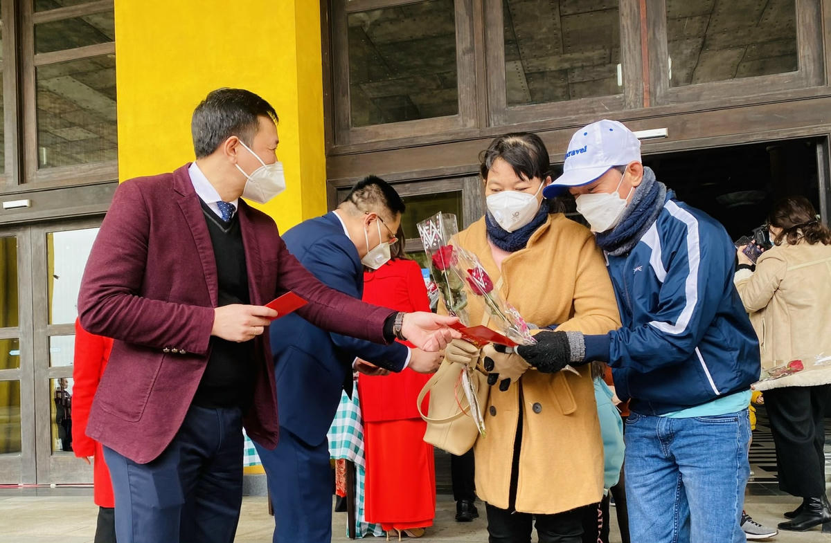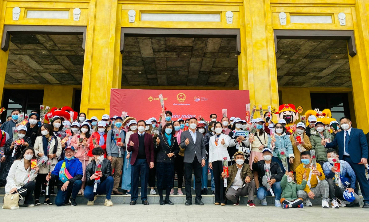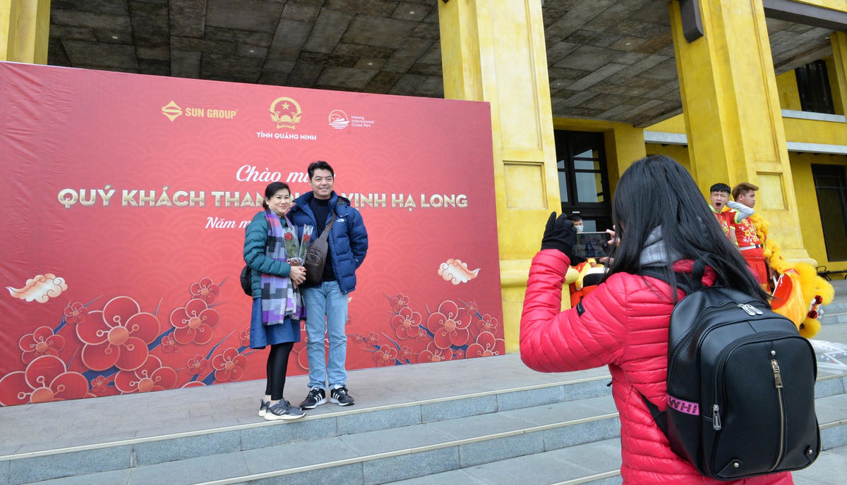Phó Chủ tịch UBND tỉnh Quảng Ninh Nguyễn Thị Hạnh cùng lãnh đạo Sở Du lịch đã dành những lời chúc tốt đẹp đến với du khách "xông đất" du lịch đầu xuân năm mới và tặng hoa, lì xì thay cho lời cảm ơn.