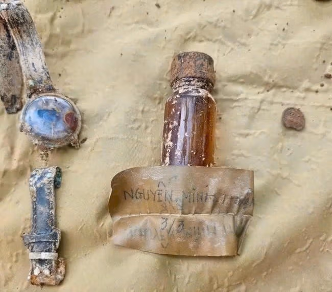 Tại hiện trường, lực lượng chức năng đã thu thập được nhiều di vật, như: Dao, dây thắt lưng, hộp tiếp đạn, đồng hồ đeo tay... Đặc biệt, trong số các di vật có một lọ thủy tinh, bên trong có mảnh giấy ghi tên “Nguyễn Minh Thuận”.