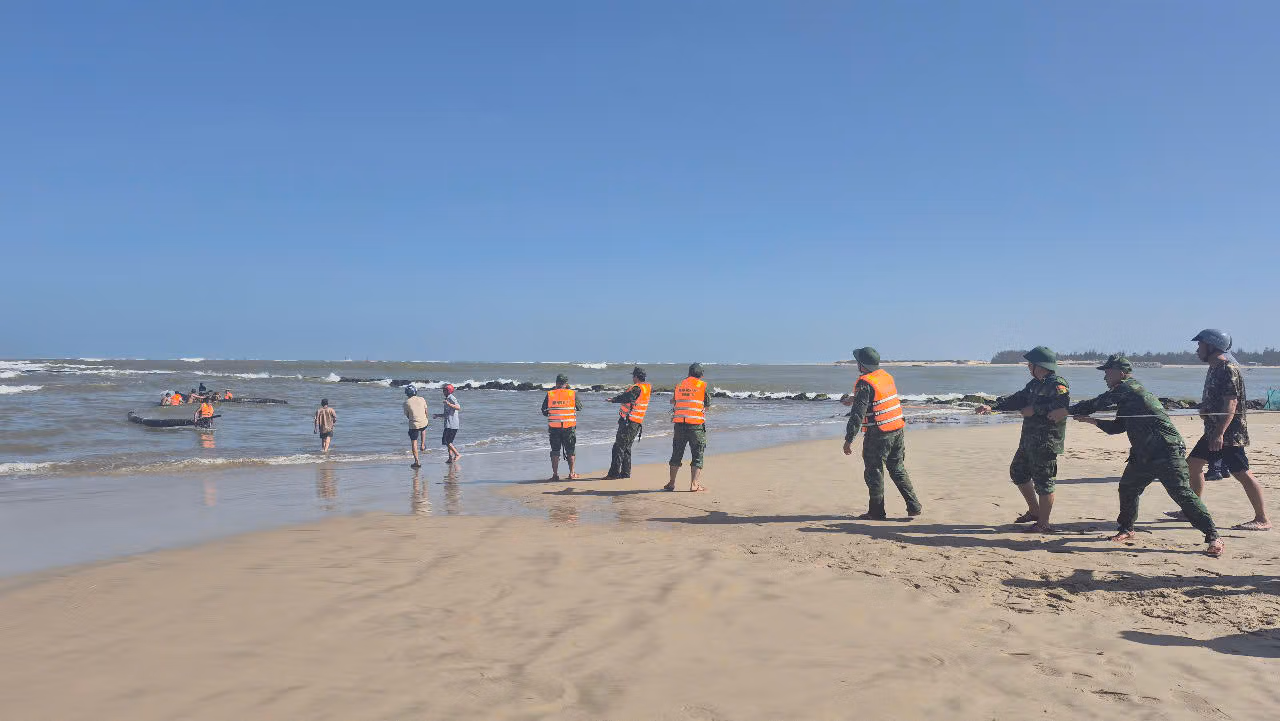 Đồn Biên phòng cửa khẩu cảng Cửa Việt đã huy động 10 cán bộ chiến sĩ phối hợp với các lực lượng và người dân trên địa bàn triển khai kéo ghe bị sóng đánh chìm vào bờ.
