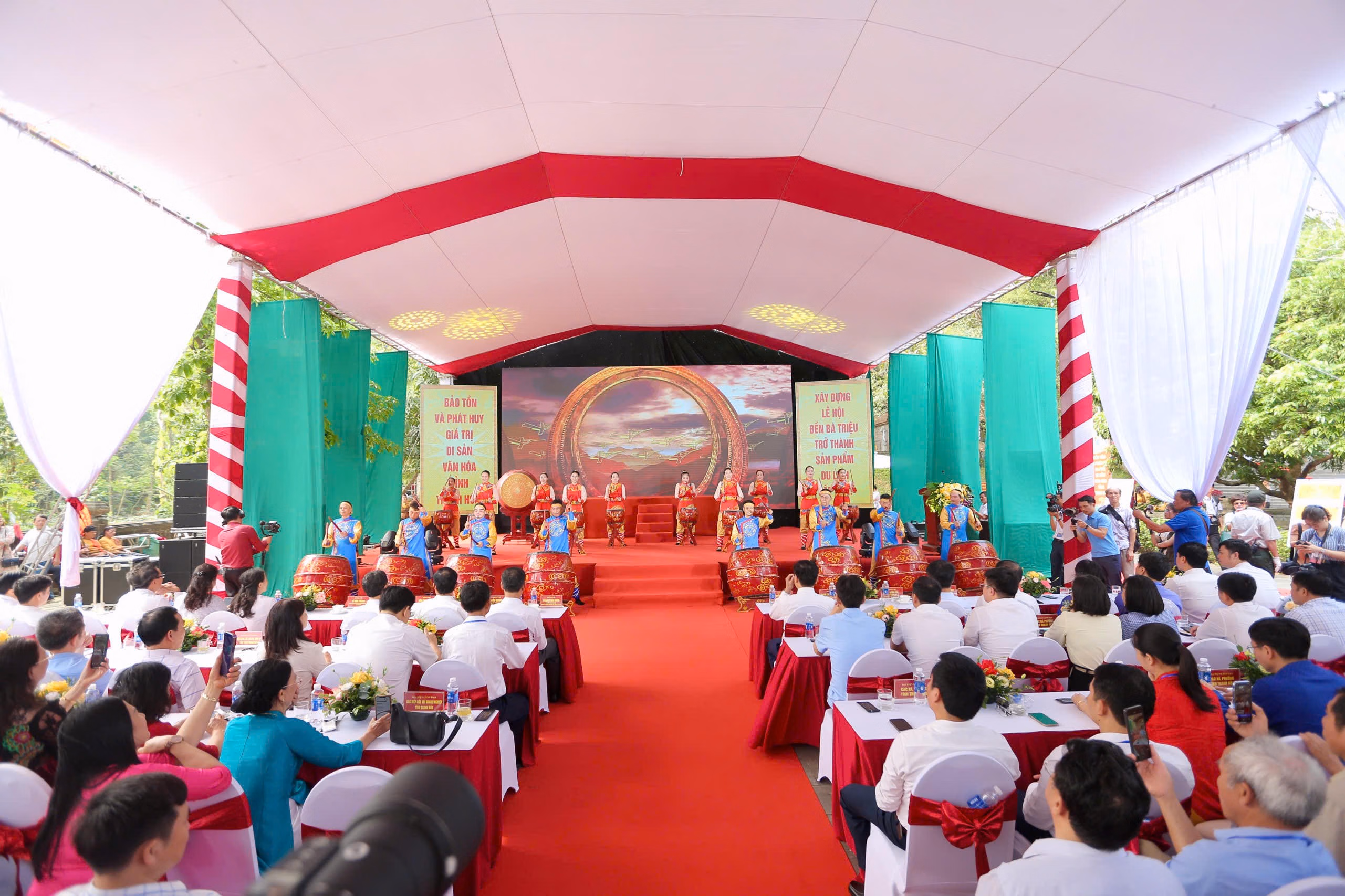 Sau các nghi thức phần lễ, Phó Chủ tịch UBND tỉnh Đầu Thanh Tùng đã đánh hồi trống khai hội lễ hội đền Bà Triệu năm 2026. Tiếp đó, là chương trình nghệ thuật sân khấu hóa giàu tính sử thi với chủ đề 'Anh hùng dân tộc Triệu Thị Trinh - Rạng ngời trang sử vàng dân tộc'.
