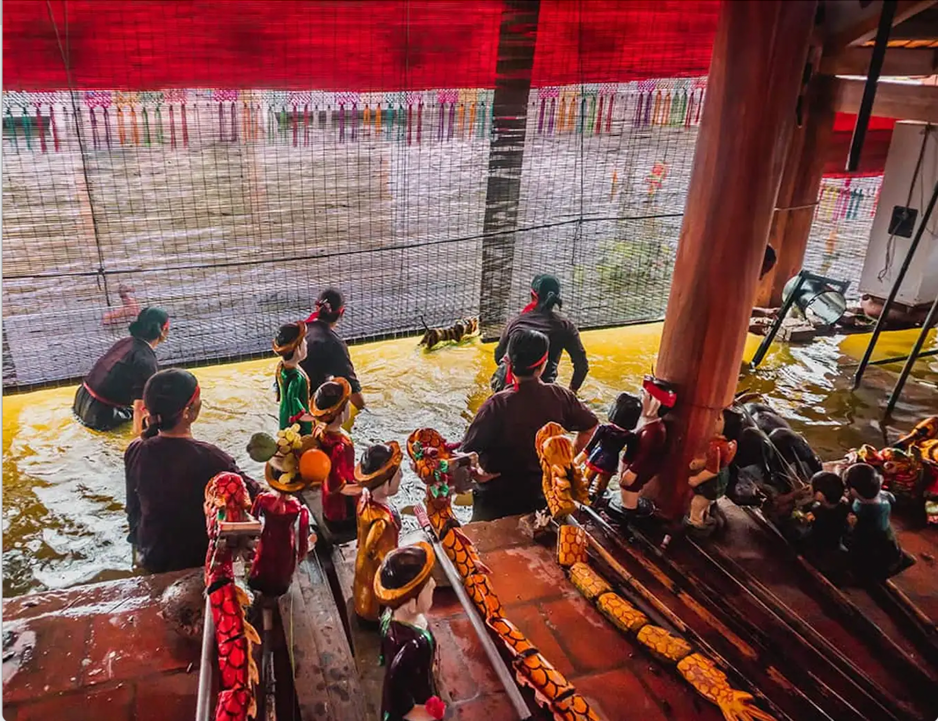 Một điểm đặc biệt khác khi nhắc đến múa rối nước chính là hình thức sân khấu dưới nước. Đối với môn nghệ thuật biểu diễn đặc biệt này - nước là một yếu tố rất quan trọng, giúp con rối sinh động, hấp dẫn và tạo ra rất nhiều tình tiết bất ngờ kích thích sự tò mò. Tại nhà hát múa rối nước, các màn trình diễn sẽ được chuẩn bị chỉn chu, kĩ càng: sân khấu dưới nước được đặt ở chính giữa, bên cạnh là những nghệ sĩ phụ trách phần âm thanh với nhiều nhạc cụ khác nhau, phía sau mô phỏng mái đình làng truyền thống cùng với tấm rèm tre ngăn cách với buồng trò. Những yếu tố truyền thống đặc trưng trong sân khấu múa rối nước vẫn được tái hiện nguyên vẹn nhất, cho dù ở một không gian hiện đại hơn, đã giúp du khách có một trải nghiệm ấn tượng nhất về loại hình nghệ thuật này.