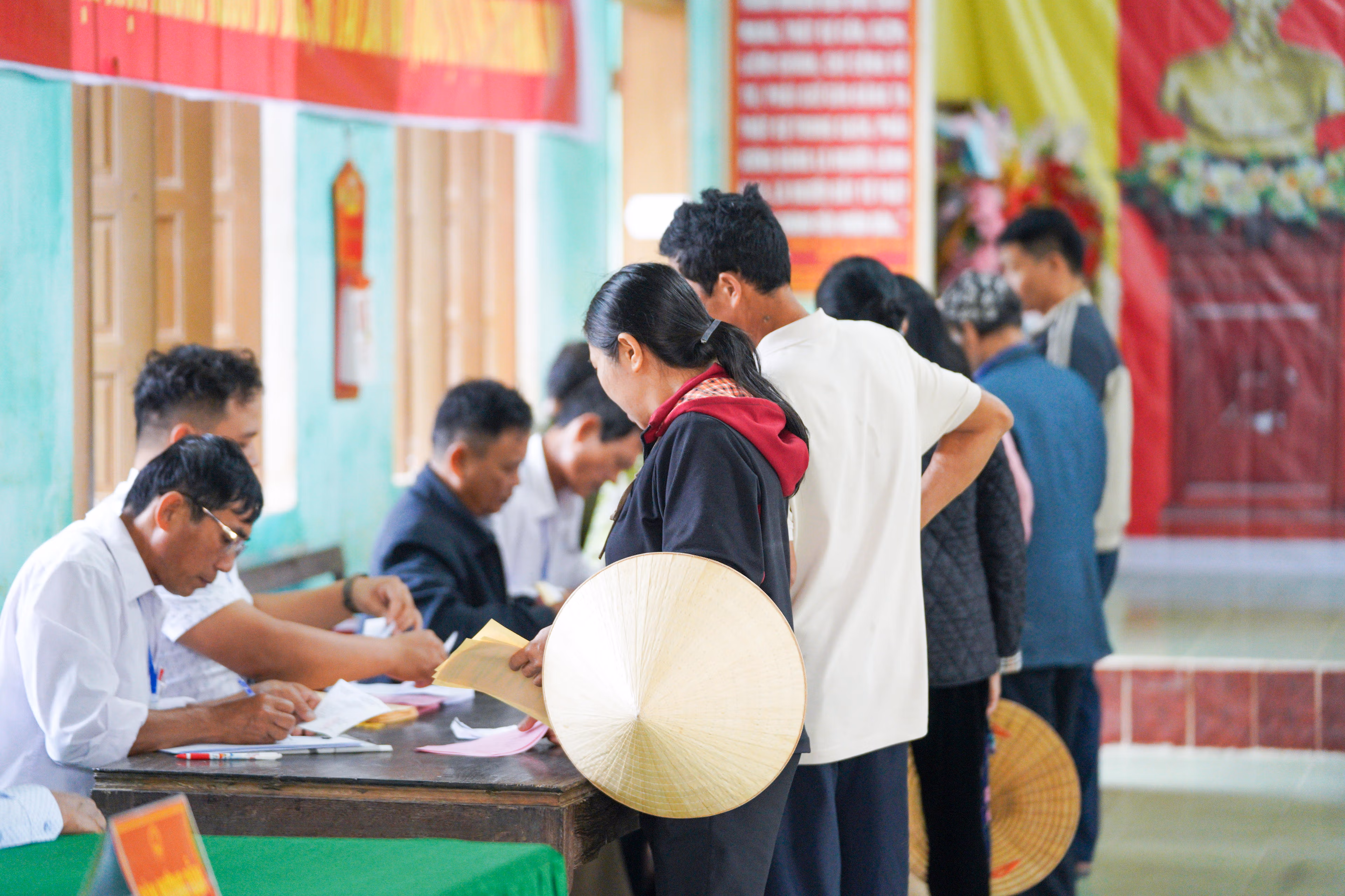 Giữa dòng người đến khu vực bầu cử, hình ảnh những chiếc nón lá quen thuộc xuất hiện ở nhiều nơi. Có người đội nón che nắng, có người vừa rời khung nón đã vội đến bỏ phiếu. Những chiếc nón giản dị, sản phẩm từ bàn tay khéo léo của người dân làng nghề dường như cũng trở thành một phần đặc trưng của không khí ngày bầu cử nơi đây.