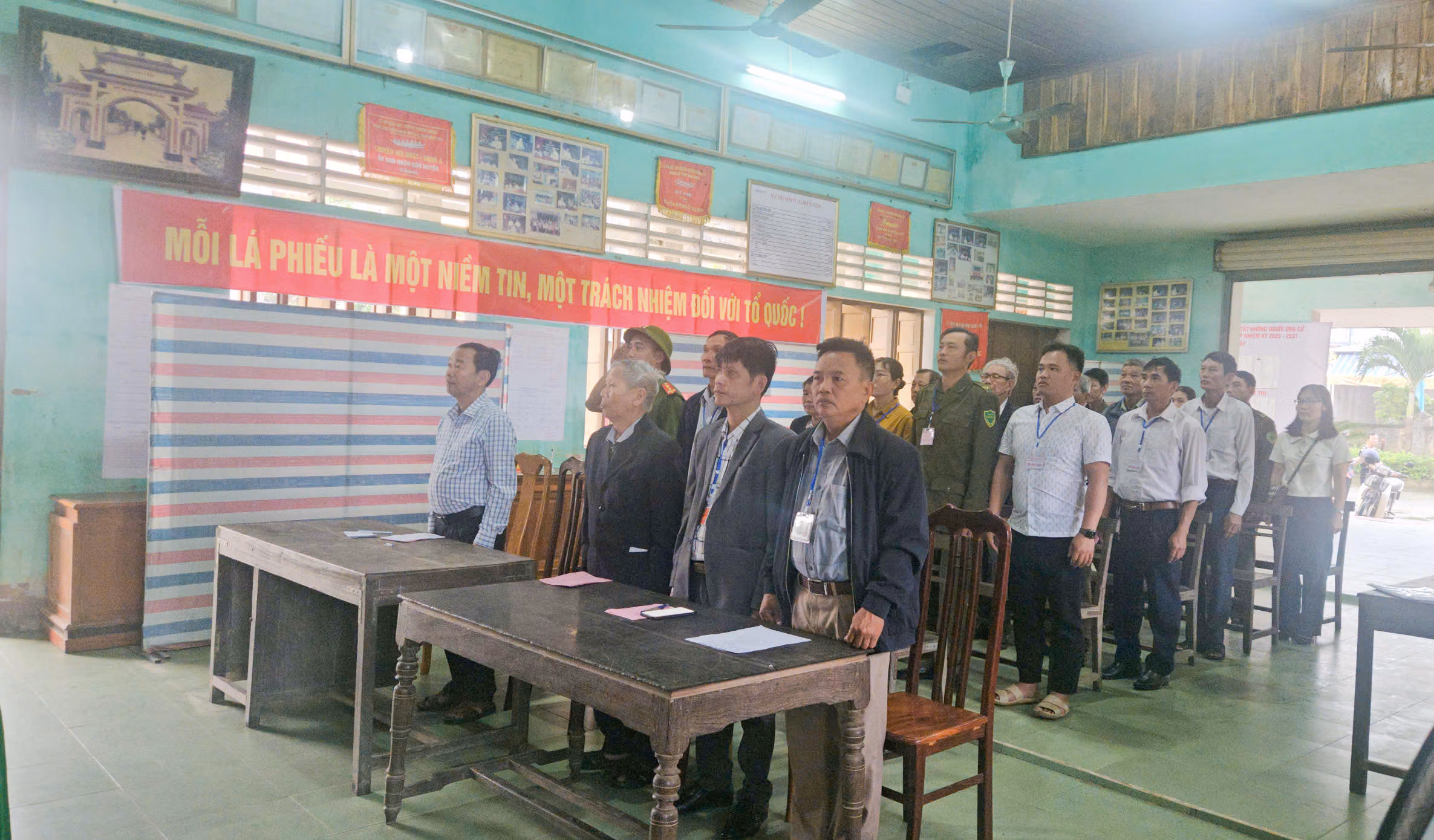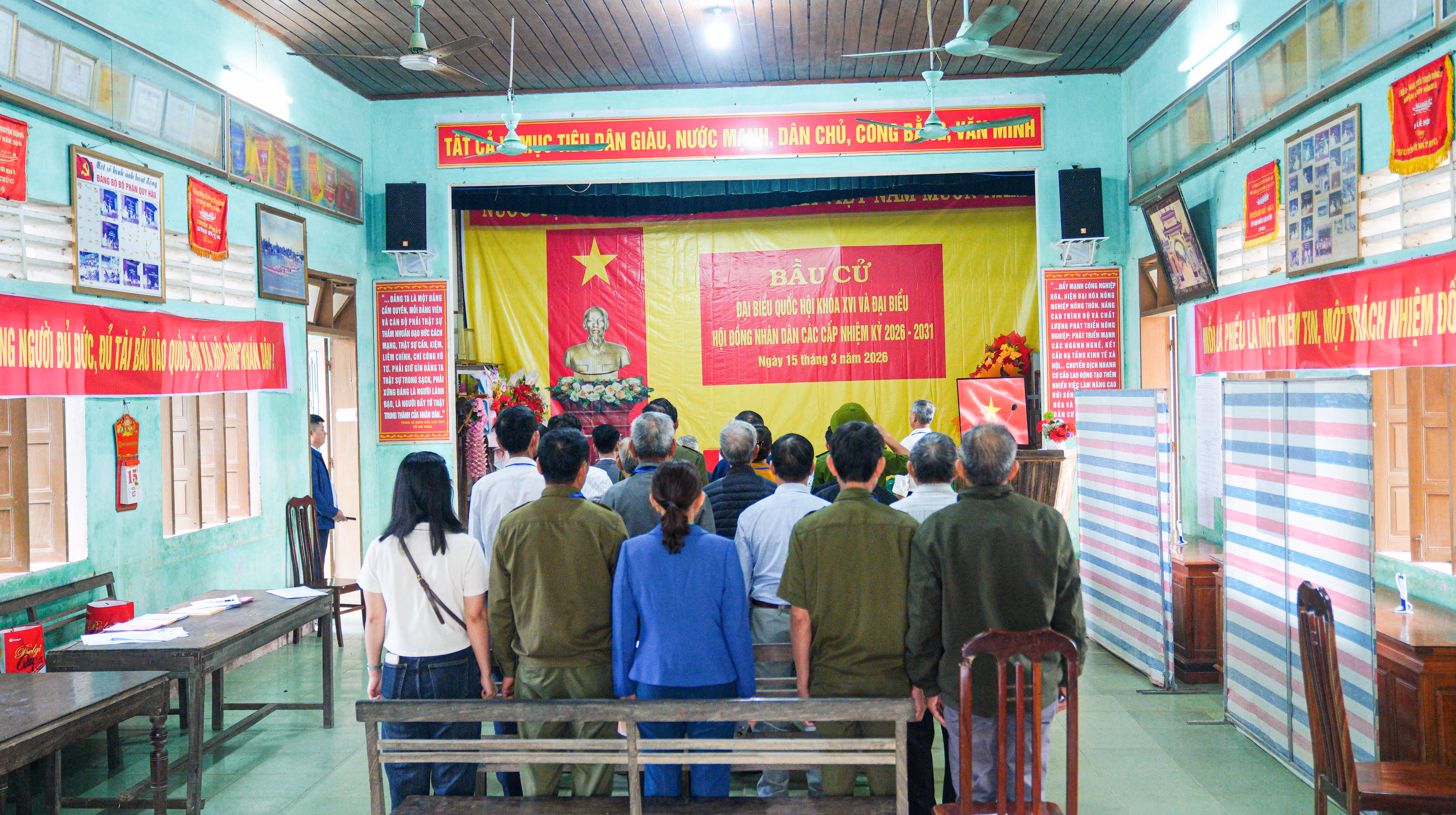 Sáng 15/3, từ sớm, khu vực bỏ phiếu số 20 tại Nhà văn hóa thôn Quy Hậu đã nhộn nhịp cử tri đến tham gia bầu cử. Trên các tuyến đường nhỏ của làng, cờ Tổ quốc đỏ thắm được treo trước mỗi mái nhà, tạo nên không khí trang trọng, rộn ràng của ngày hội lớn.