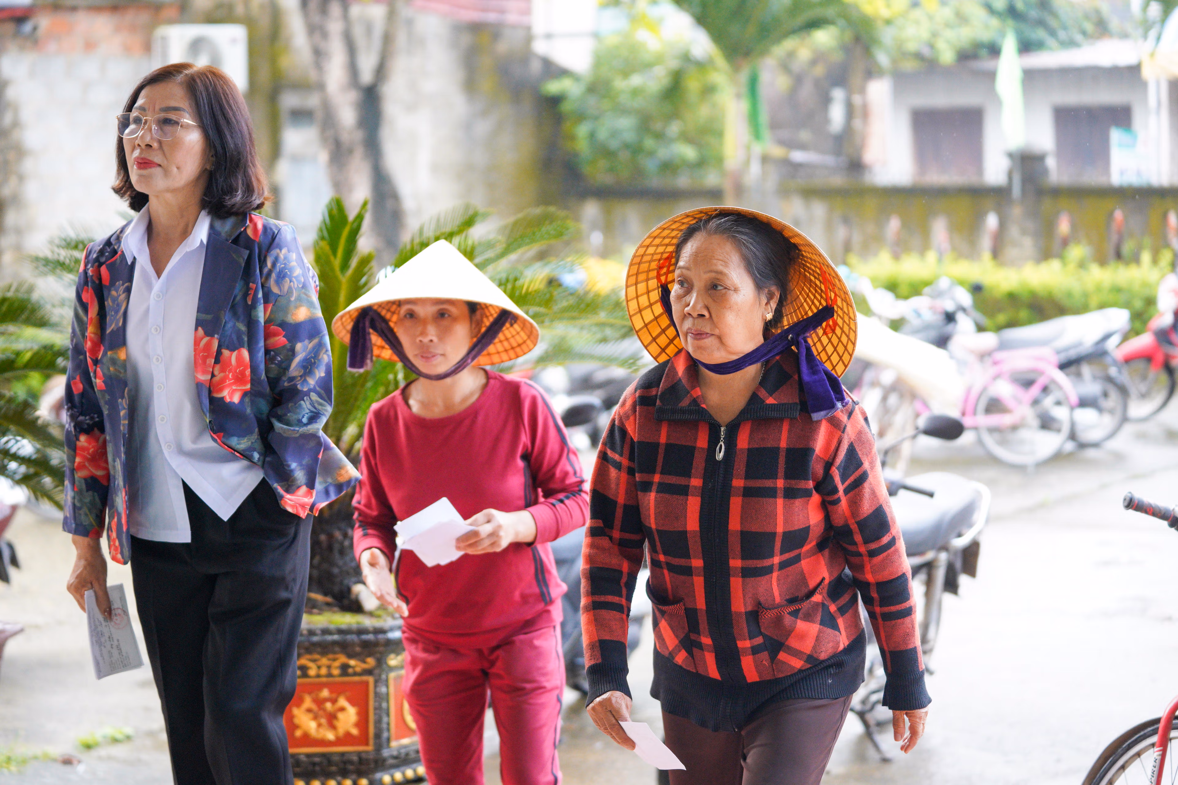 Quy Hậu từ lâu được biết đến là làng nghề làm nón truyền thống. Trong những ngôi nhà nhỏ, bên hiên hay dưới tán cây trước sân, người thợ vẫn thường ngày cần mẫn chằm từng mũi kim qua lớp lá để tạo nên những chiếc nón trắng giản dị. Tuy nhiên, trong buổi sáng đặc biệt này, nhiều người tạm gác lại những vành nón còn dang dở để chỉnh trang trang phục, cùng nhau đến khu vực bỏ phiếu.