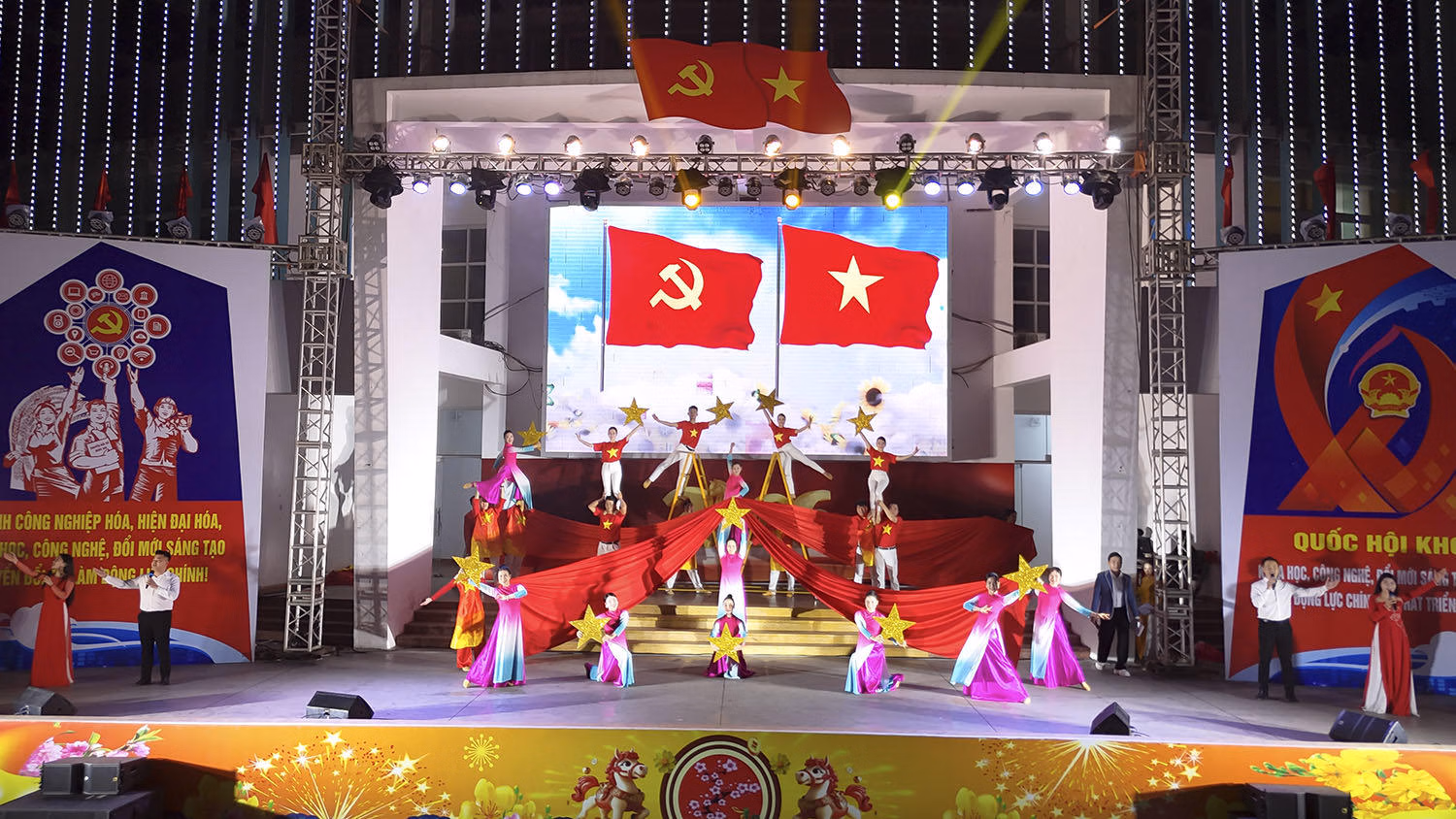 Hay tốp ca múa “Vinh quang Quốc hội” (Đội Tuyên truyền lưu động tỉnh Gia Lai) thể hiện tác phẩm hào hùng ca ngợi lịch sử và vai trò của Quốc hội, tôn vinh sự đoàn kết, trí tuệ và chặng đường của Quốc hội trong sự nghiệp xây dựng và bảo vệ Tổ quốc.