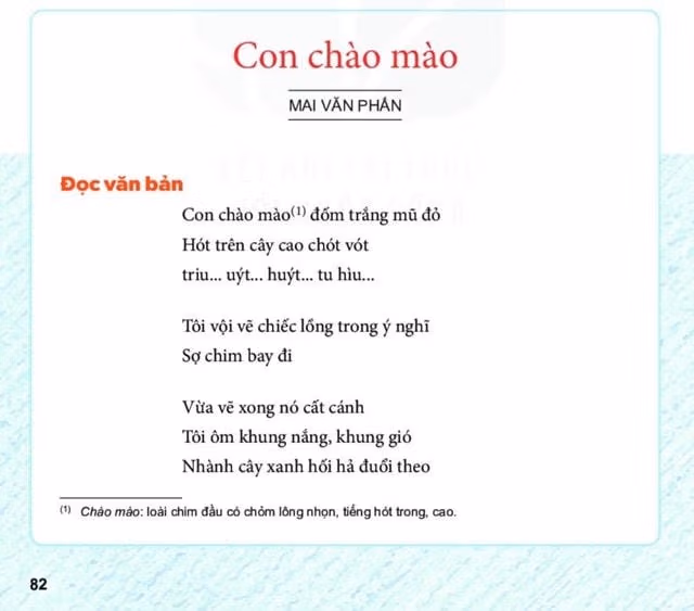 Chưa hết, bài thơ “Con chào mào” của tác giả Mai Văn Phấn trong sách giáo khoa Ngữ văn lớp 6 thuộc bộ sách Kết nối tri thức với cuộc sống cũng đang gây ra tranh luận trên mạng xã hội.