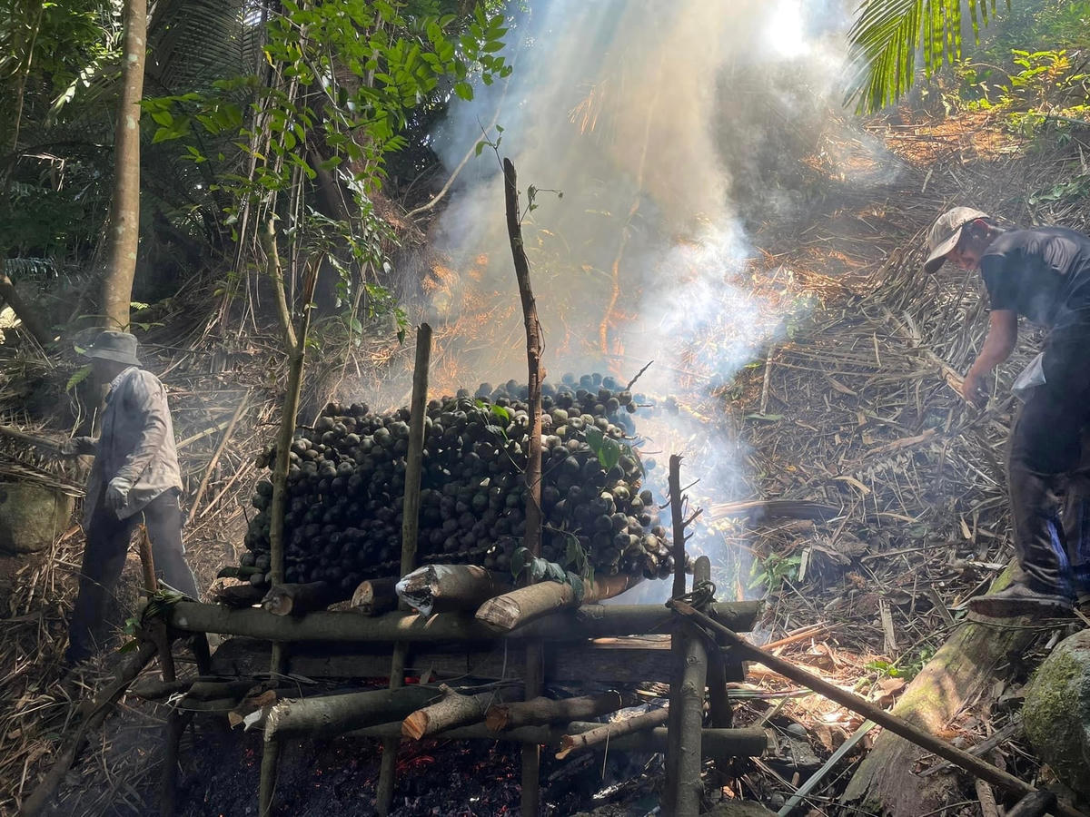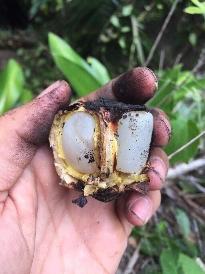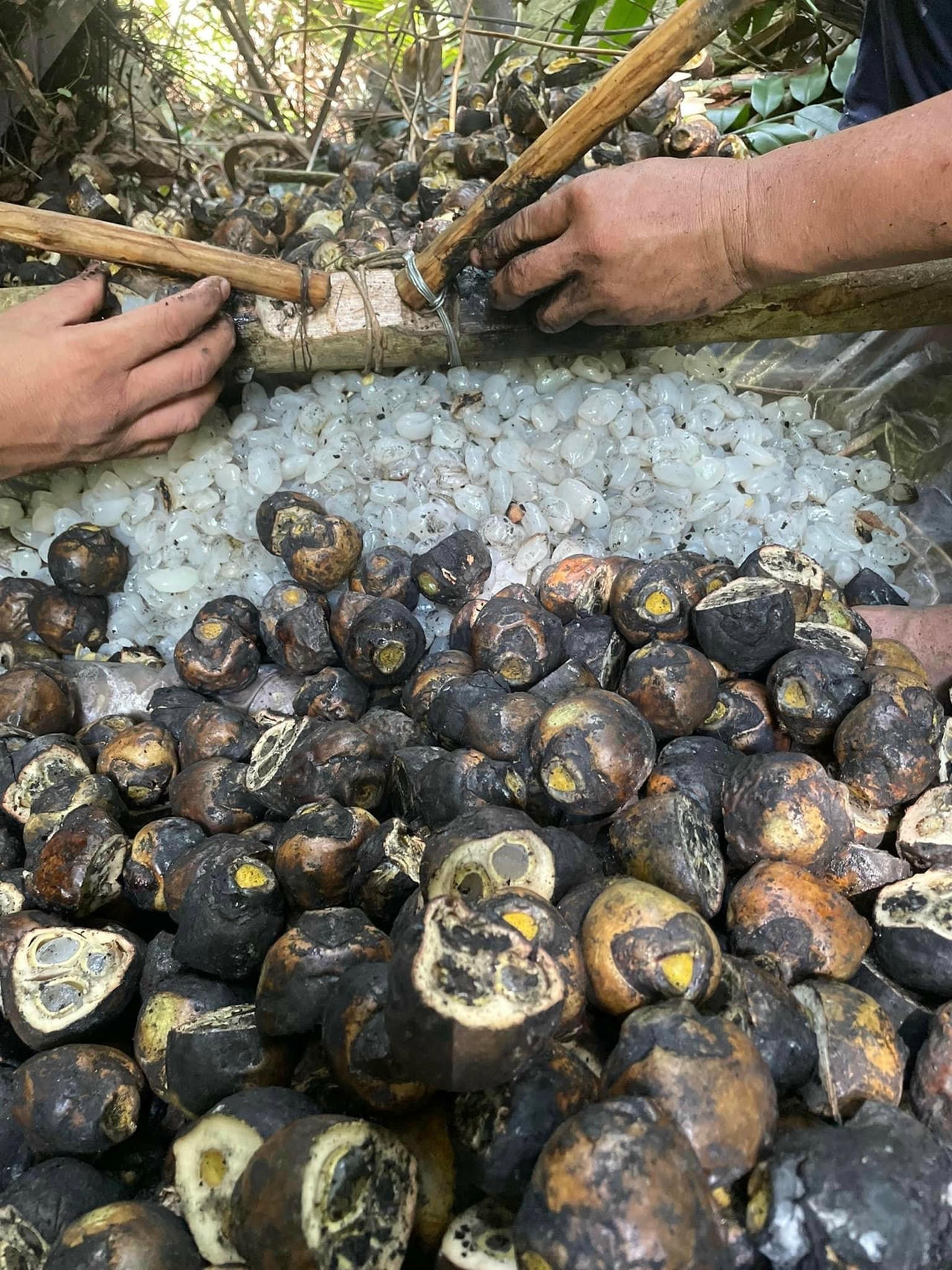 Chúng tôi rất bất ngờ khi chỉ mất chừng 30 phút là 4 người đàn ông đã chặt được một đống lớn quả đác như đống rơm nhỏ. Tuy nhiên, công đoạn vất vả nhất của người thợ rừng khai thác đác bây giờ mới bắt đầu. “Đác chặt trên cây xuống chỉ là khởi đầu thôi, bây giờ quan trọng nhất là đốt và lấy đác. Quả đác lấy trên cây xuống có vị chát và ngứa do nhựa nếu ăn ngay. Ngoài ra vỏ của chúng dày và cứng lắm, rất khó lấy phần hạt bên trong. Vì vậy chúng tôi phải đốt qua bằng lửa, cho chúng cháy mềm lớp vỏ và cũng tan nhựa để hết vị ngứa chát của hạt”, anh Vỹ vừa kể vừa chất đống quả đác lên mấy tàu lá khô. Đây là khu vực nằm sát bên bờ một con suối nhỏ có nước chảy từ trên cao xuống, xung quanh có nhiều tảng đá nhẵn nhụi bị bào mòn. Những tàn than hồng làm cho từng quả đác rụng lả tả, cháy sém lại. Những người bạn đi rừng còn lại lúc này mới lấy đồ nghề ra, là con dao và chiếc kẹp chuyên dụng được chế tác từ cây gỗ nhỏ để lấy hạt đác. Họ vừa dùng dao cắt một miếng nhỏ trên quả đác vừa cháy sém, vừa sử dụng cái kẹp để bóp quả đác, làm cho hạt đác màu trắng đục trôi ra từ vết vừa cắt.