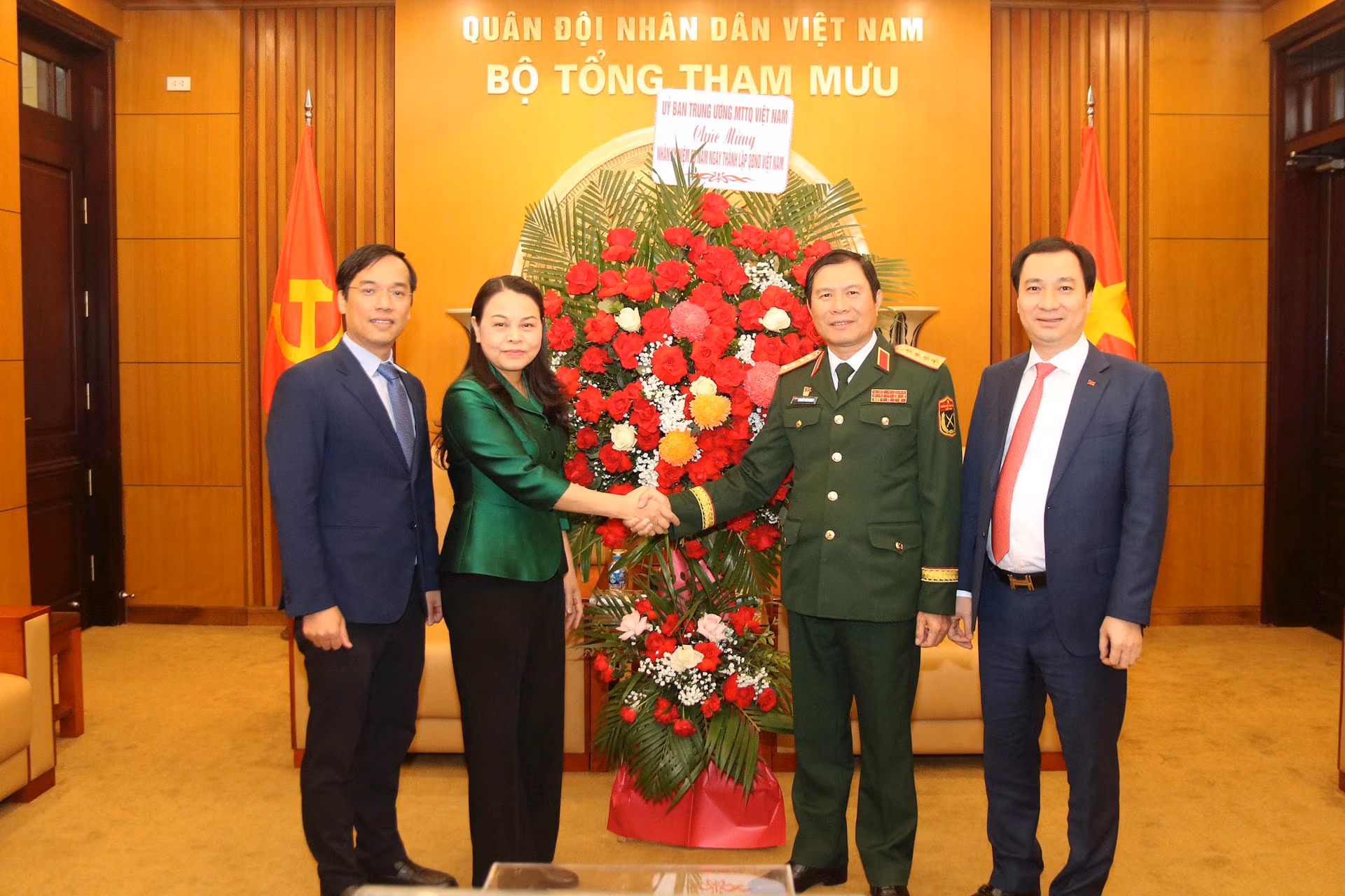 *Cùng ngày, bà Nguyễn Thị Thu Hà, Ủy viên Trung ương Đảng, Phó Chủ tịch - Tổng Thư ký UBTƯ MTTQ Việt Nam đã tới thăm, chúc mừng Bộ Tổng Tham mưu Quân đội nhân dân Việt Nam. Đại tướng Nguyễn Tân Cương, Ủy viên Trung ương Đảng, Ủy viên Thường vụ Quân ủy Trung ương, Tổng Tham mưu trưởng Quân đội nhân dân Việt Nam, Thứ trưởng Bộ Quốc phòng thân mật tiếp toàn.
