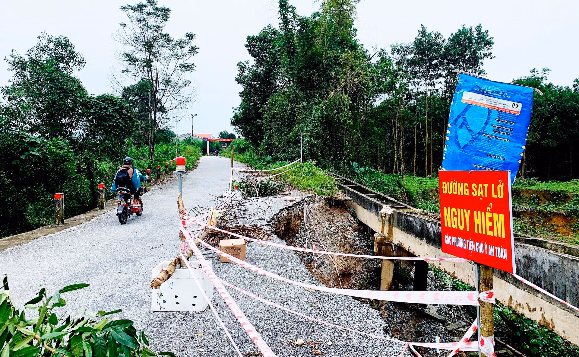 Sau trận mưa lớn, tuyến đường liên huyện tại thị trấn Vũ Quang (huyện Vũ Quang, tỉnh Hà Tĩnh) bất ngờ sạt lở làm gãy mương thoát nước, ăn sâu vào lòng đường gây mất an toàn giao thông.