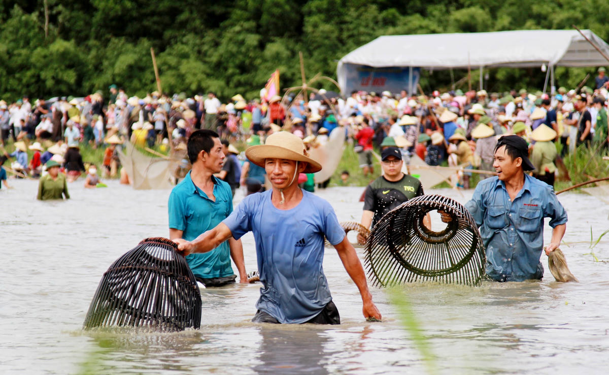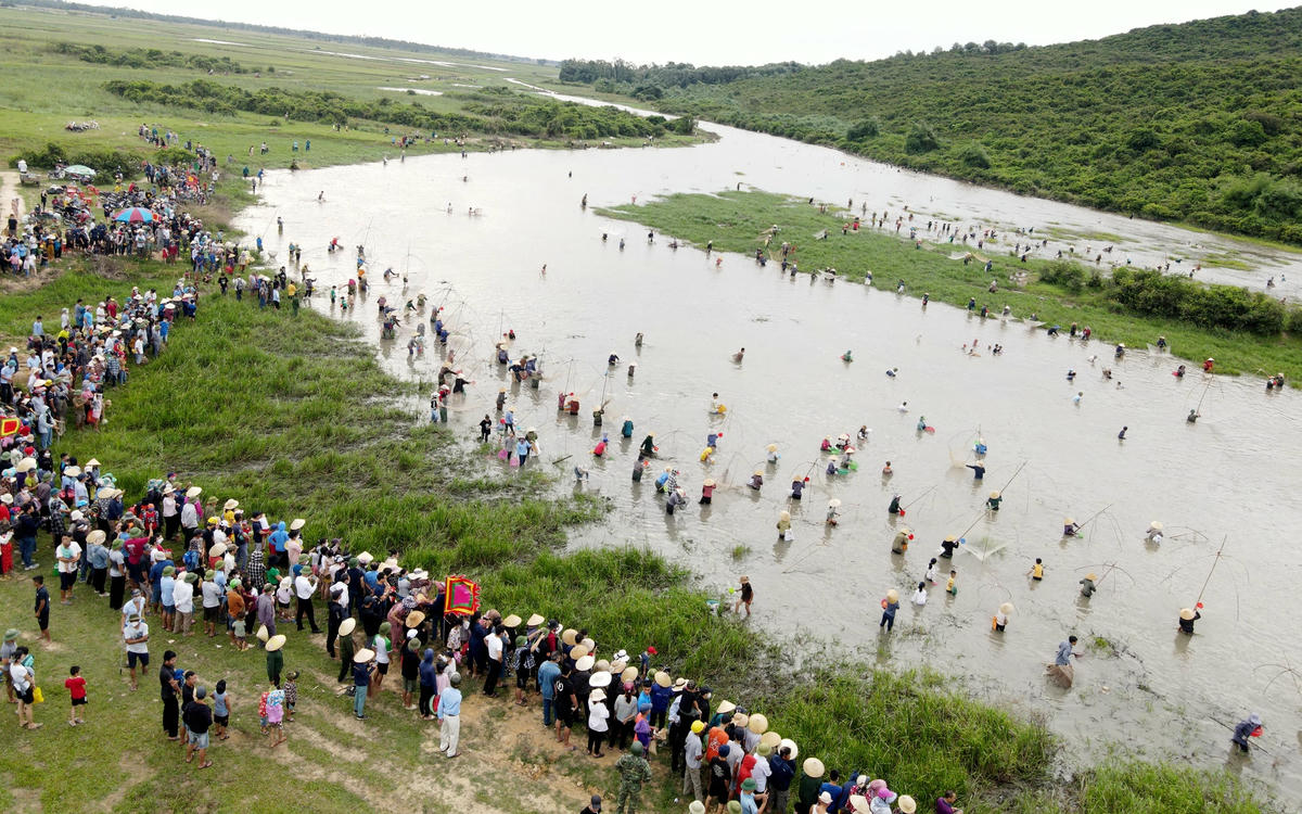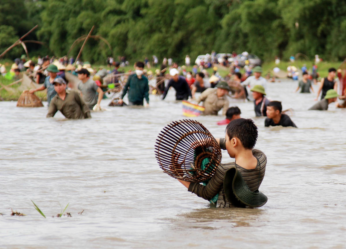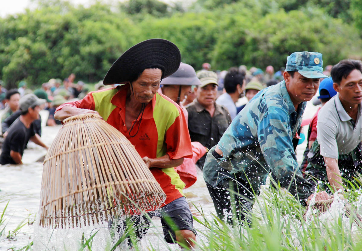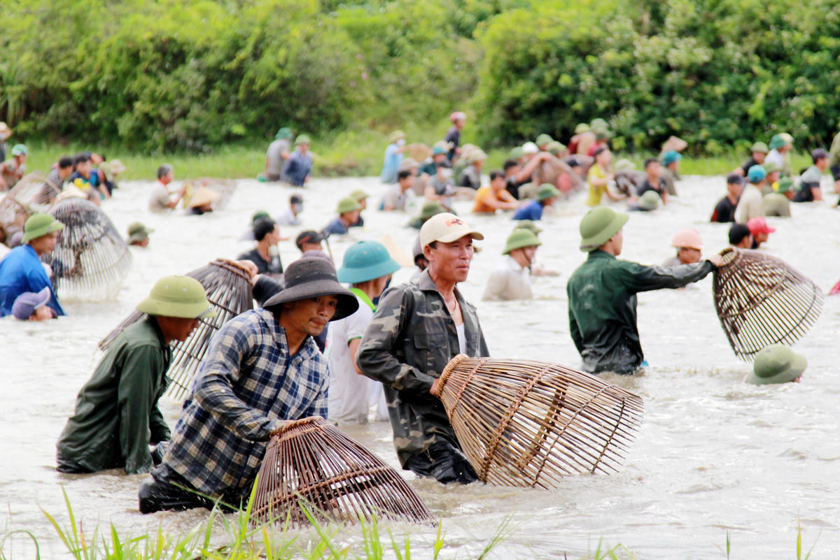 Sau tiếng trống khai hội, hàng nghìn người dân từ già trẻ, trai gái tay cầm mơn, vó… nô nức đua nhau xuống đầm Vực Rào để bắt cá.