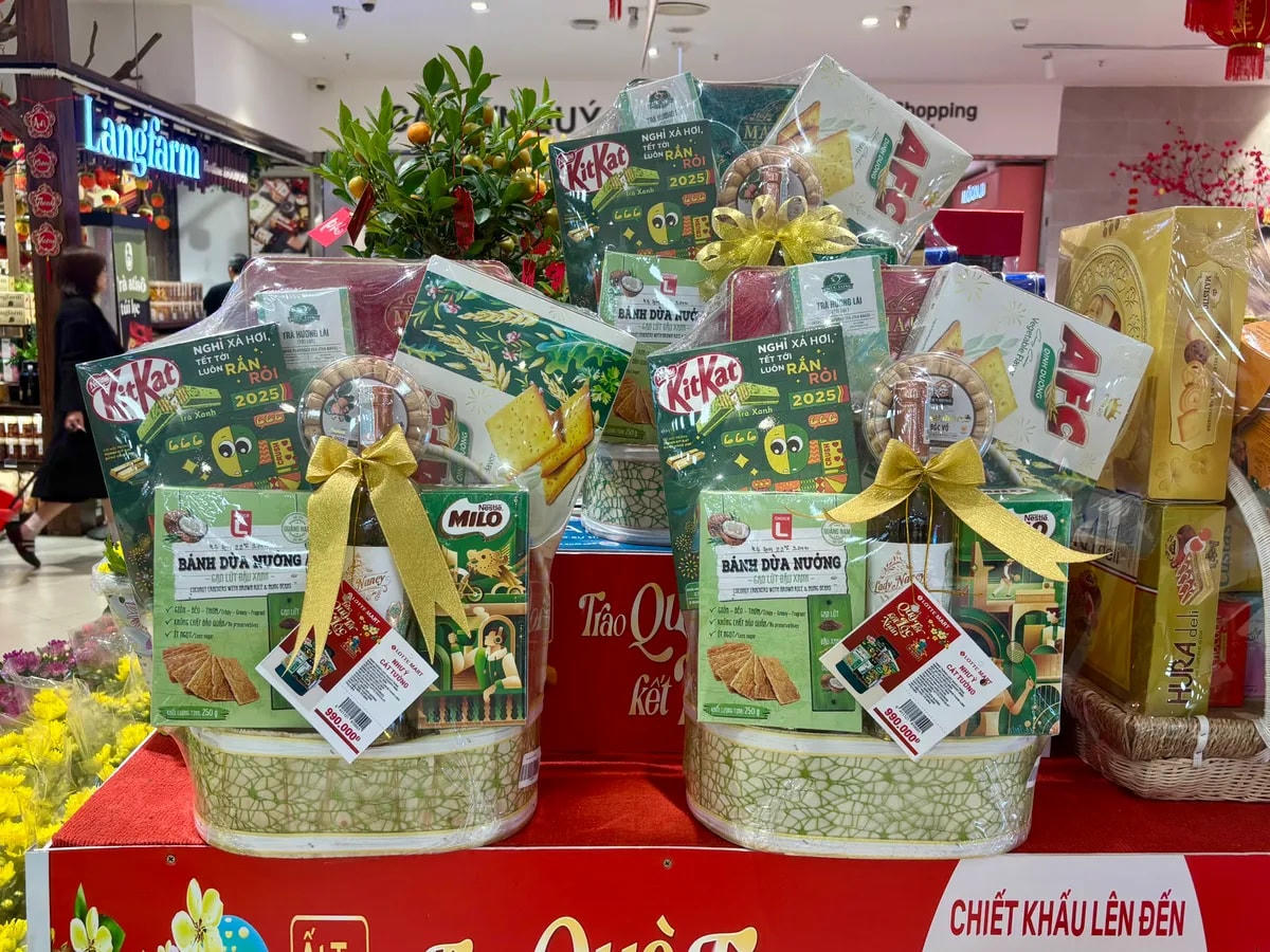 Nhìn chung, thị trường hàng Tết tại các siêu thị, trung tâm thương mại ngày càng tấp nập những dịp cận Tết. Đại diện một quầy bán quà tết tại siêu thị cho biết, các gói quà Tết đã được bày bán từ 1 tháng trước, một số các gói quà giá khoảng 500.000 đồng đã hết hàng từ sớm.