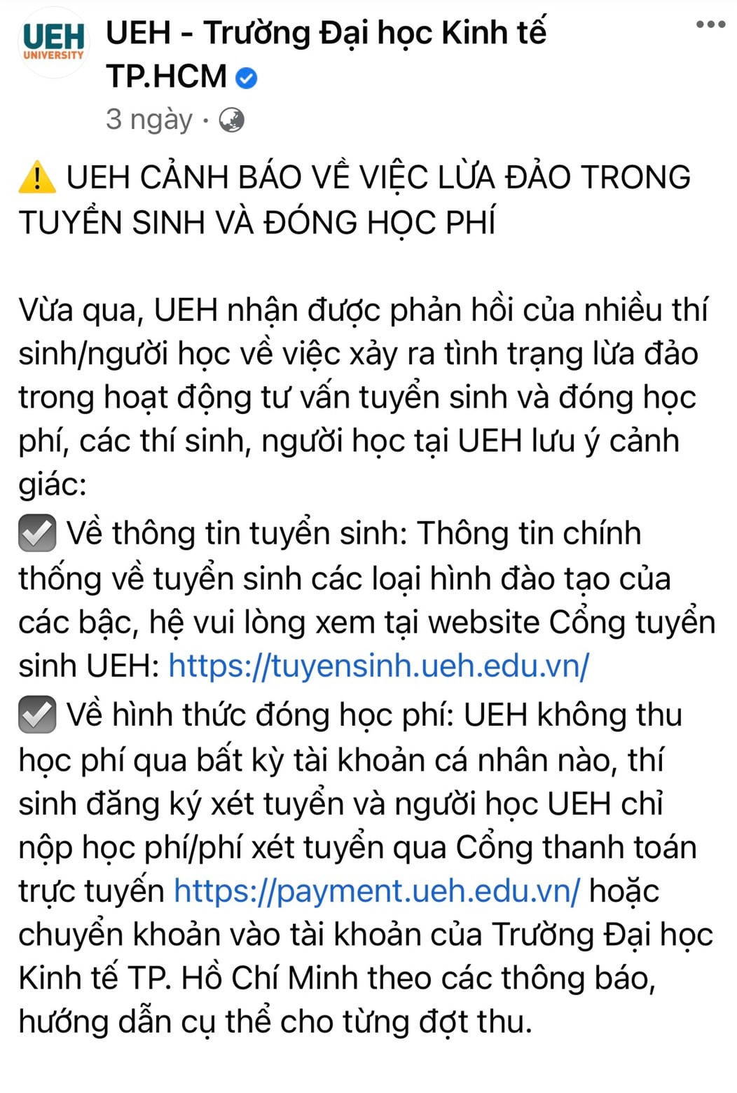 Trường Đại học Kinh tế TP Hồ Chí Minh (UEH) vừa phát đi thông báo trên trang facebook nhà trường nội dung cảnh báo sinh viên về việc lừa đảo trong tuyển sinh và đóng học phí.