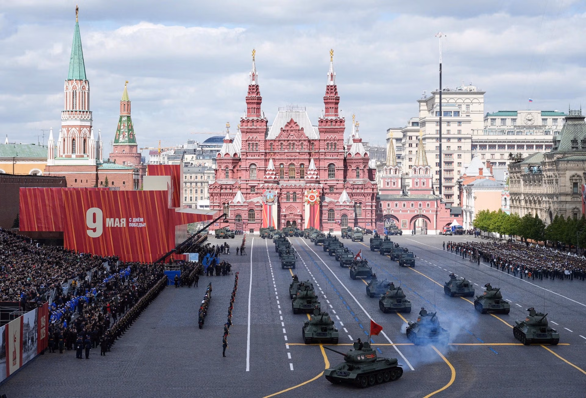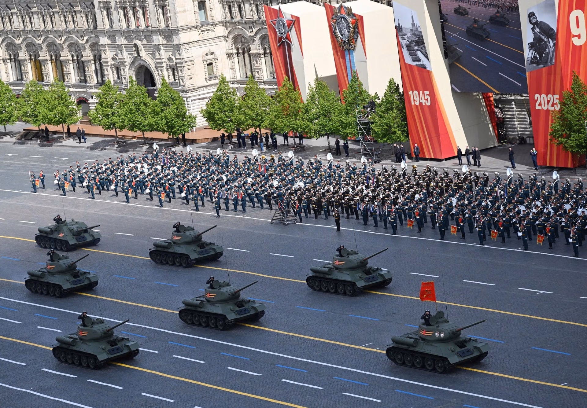 Xe tăng chiến đấu T-34-85 lăn bánh qua Quảng trường Đỏ, mở màn cho phần trình diễn khí tài ấn tượng trong lễ duyệt binh.