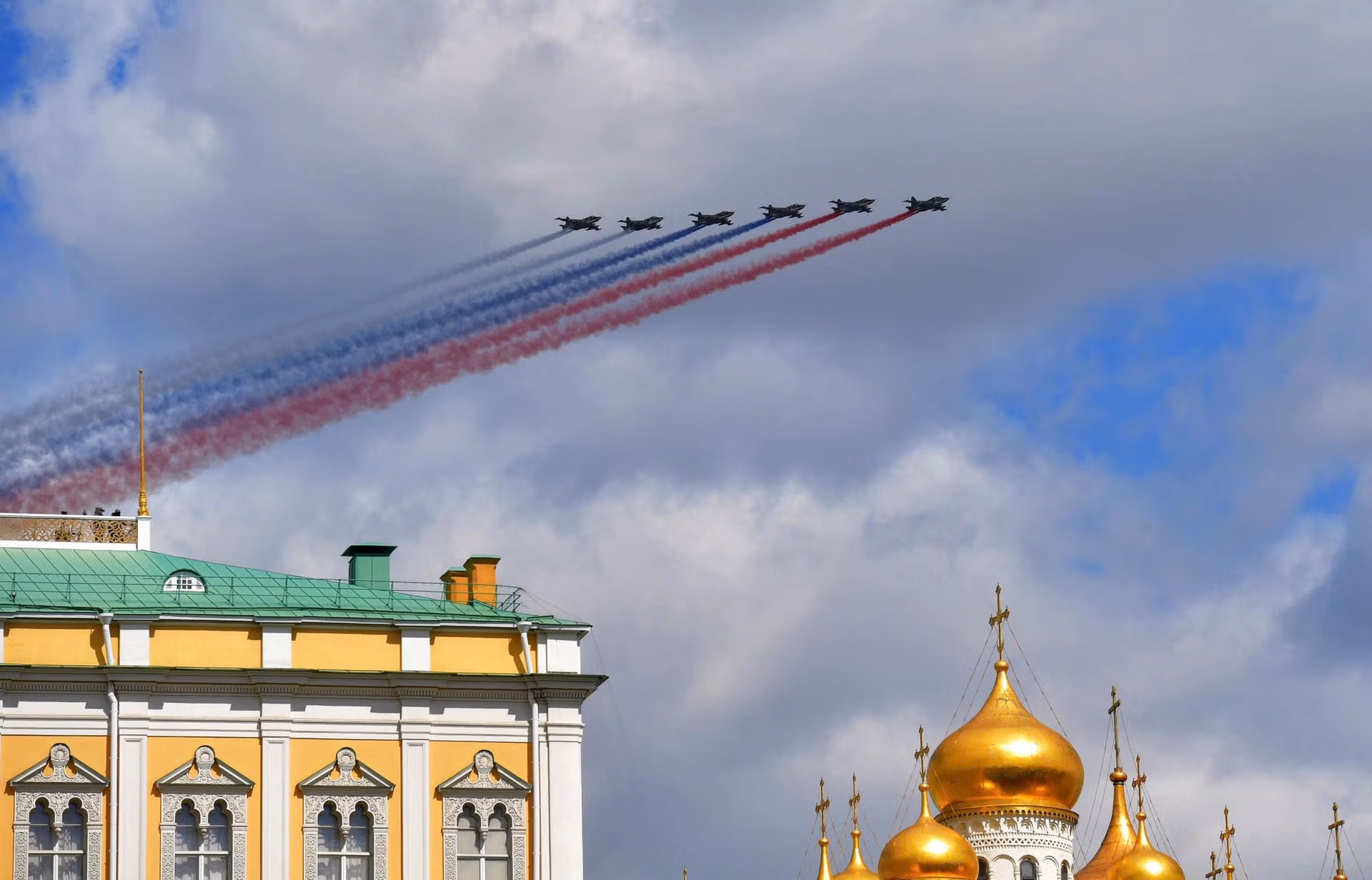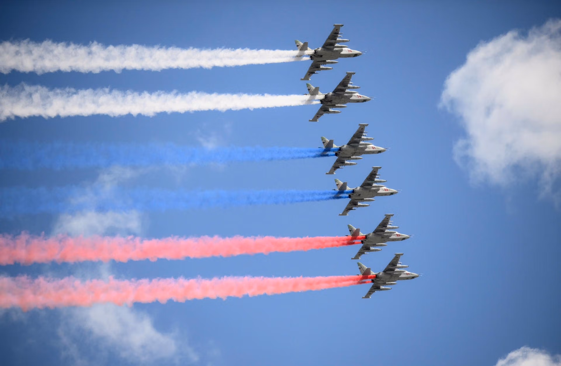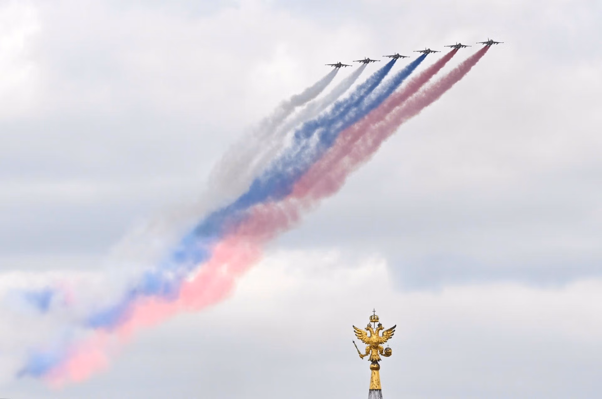 Đội hình máy bay cường kích Sukhoi Su-25 tạo nên 3 dải khói màu trắng, xanh và đỏ - màu quốc kỳ Liên bang Nga trên nền trời Moskva.