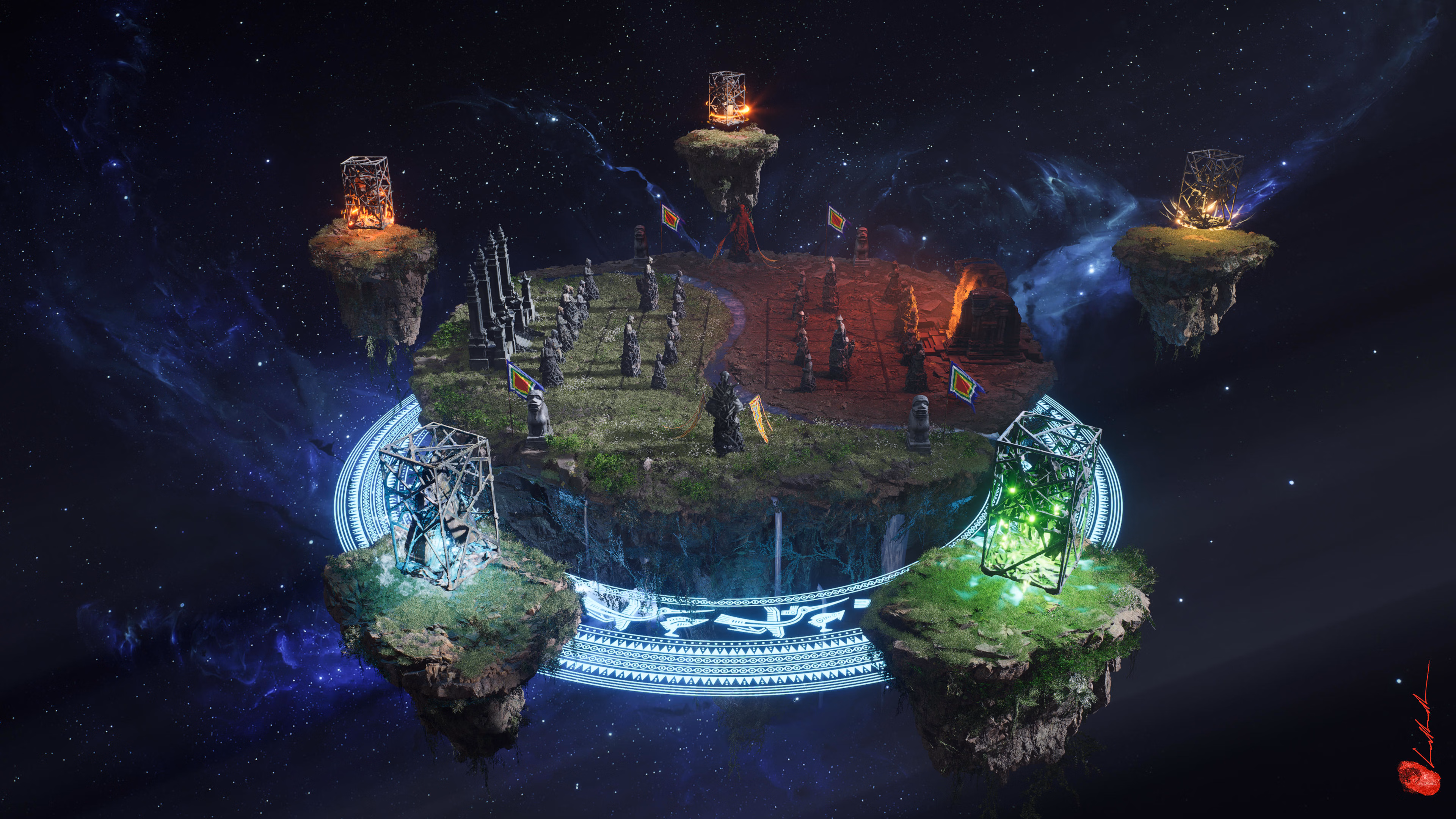 Không gian sắp đặt được tổ chức như một hành trình trải nghiệm. Người xem bước vào tác phẩm không theo một tuyến tính cố định, mà di chuyển qua nhiều lớp không gian: Từ các cụm tượng thần, đến trận đồ bát quái, rồi quay về trung tâm là Ngôi Nhà, trước khi kết thúc ở bức sơn mài khổ lớn. Hệ thống 12 pho tượng “Thần bảo hộ” xuất hiện xuyên suốt không gian, đại diện cho các nguyên tố ngũ hành và những lực lượng gắn liền với đời sống nông nghiệp. Họ không mang danh tính cụ thể, mà tượng trưng cho những con người vô danh - những cá nhân bình dị nhưng góp phần làm nên lịch sử. Điều này tạo nên một cách nhìn nhân văn: Lịch sử không chỉ thuộc về những anh hùng được ghi danh, mà còn là kết quả của sự tích lũy âm thầm từ nhiều thế hệ.