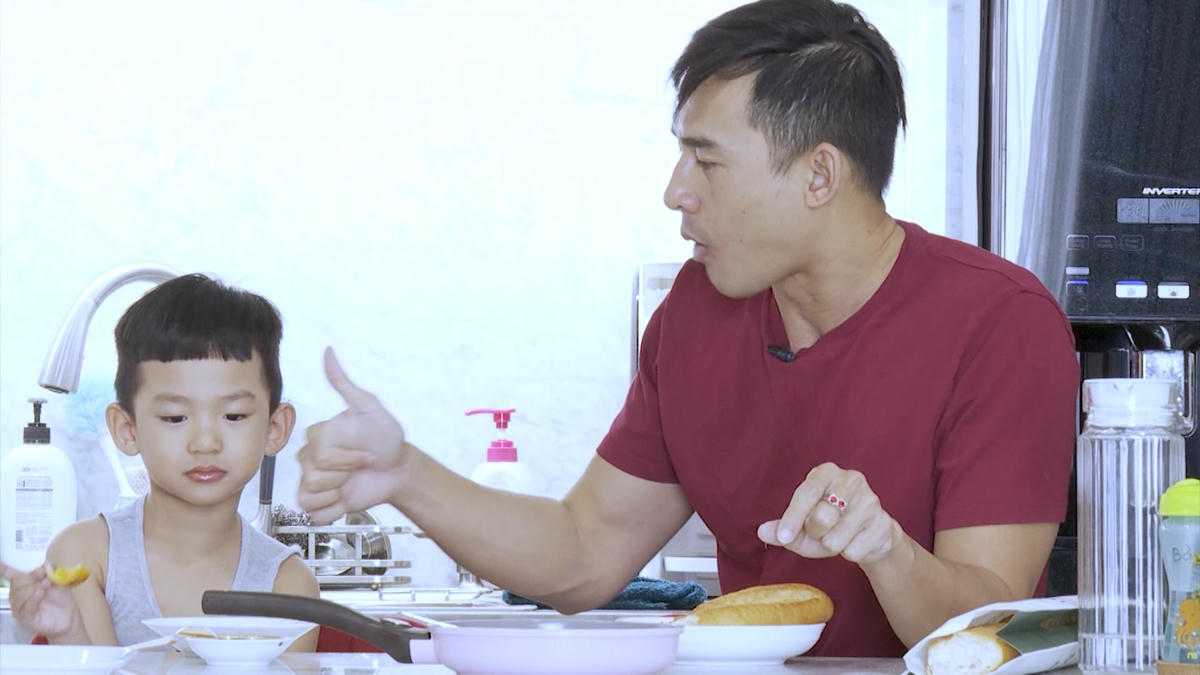 Thử thách đầu tiên của ba Thành đó là tập cho con ăn một mình. Đây cũng là lần hiếm hoi Lương Thế Thành vào bếp và sự lựa chọn của anh là chiên trứng ốp la.