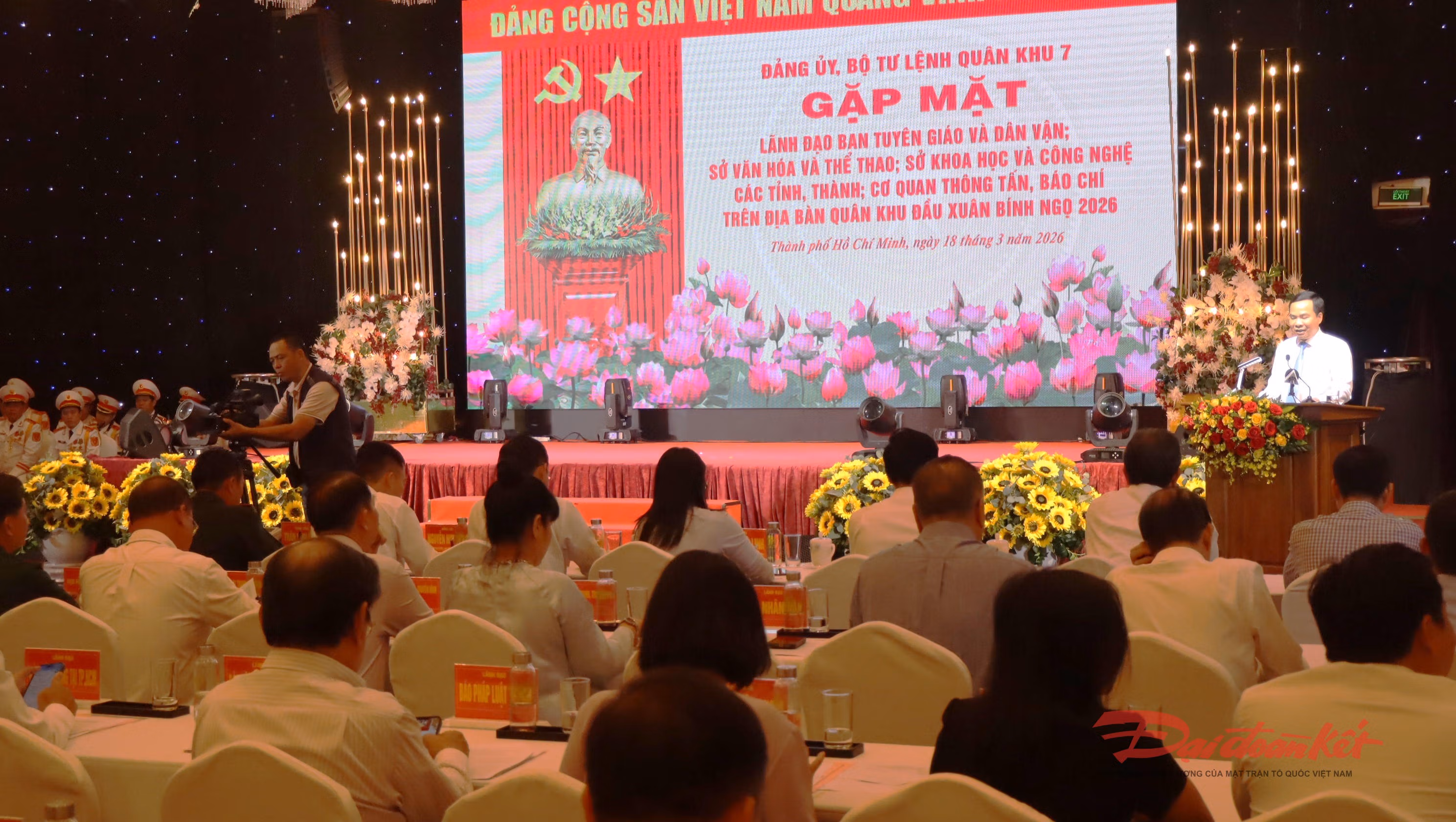 Sáng 18/3, tại TP Hồ Chí Minh, Đảng ủy, Bộ Tư lệnh Quân khu 7 tổ chức gặp mặt lãnh đạo Ban Tuyên giáo và Dân vận; Sở Văn hóa, Thể thao và Du lịch; Sở Khoa học và Công nghệ; các cơ quan thông tấn, báo chí tiêu biểu trên địa bàn Quân khu nhân dịp đầu xuân Bính Ngọ 2026.