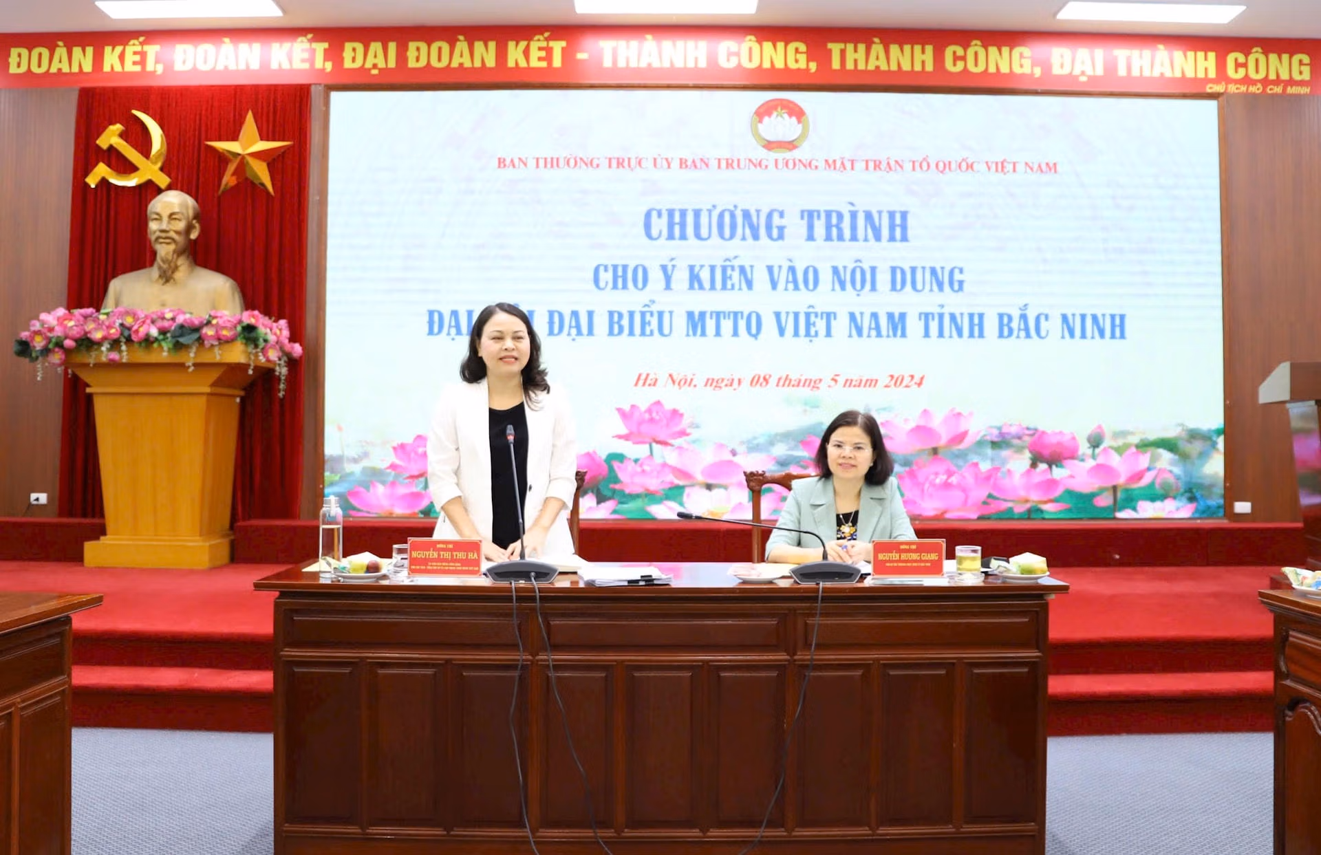 Thay mặt Ban Thường trực UBTƯ MTTQ Việt Nam, Phó Chủ tịch – Tổng Thư ký Nguyễn Thị Thu Hà đánh giá cao công tác chuẩn bị chu đáo của tỉnh Bắc Ninh trong triển khai các nội dung như văn kiện, công tác nhân sự, công tác tuyên truyền, công tác lễ tân, hậu cần chuẩn bị cho Đại hội; đồng thời trân trọng cảm ơn Ban Thường vụ Tỉnh ủy Bắc Ninh đã dành sự quan tâm rất lớn đối với công tác chuẩn bị cho Đại hội đại biểu MTTQ tỉnh Bắc Ninh lần thứ XIV, nhiệm kỳ 2024-2029.