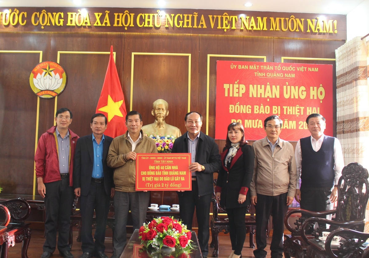 Sáng 15/1, Đoàn công tác của tỉnh Tây Ninh, do ông Nguyễn Văn Vy, Phó Chủ tịch Ủy ban MTTQ Việt Nam tỉnh làm Trưởng đoàn đã đến thăm hỏi và ủng hộ 40 căn nhà, trị giá 2 tỷ đồng cho đồng bào tỉnh Quảng Nam bị thiệt hại do bão lũ gây ra.