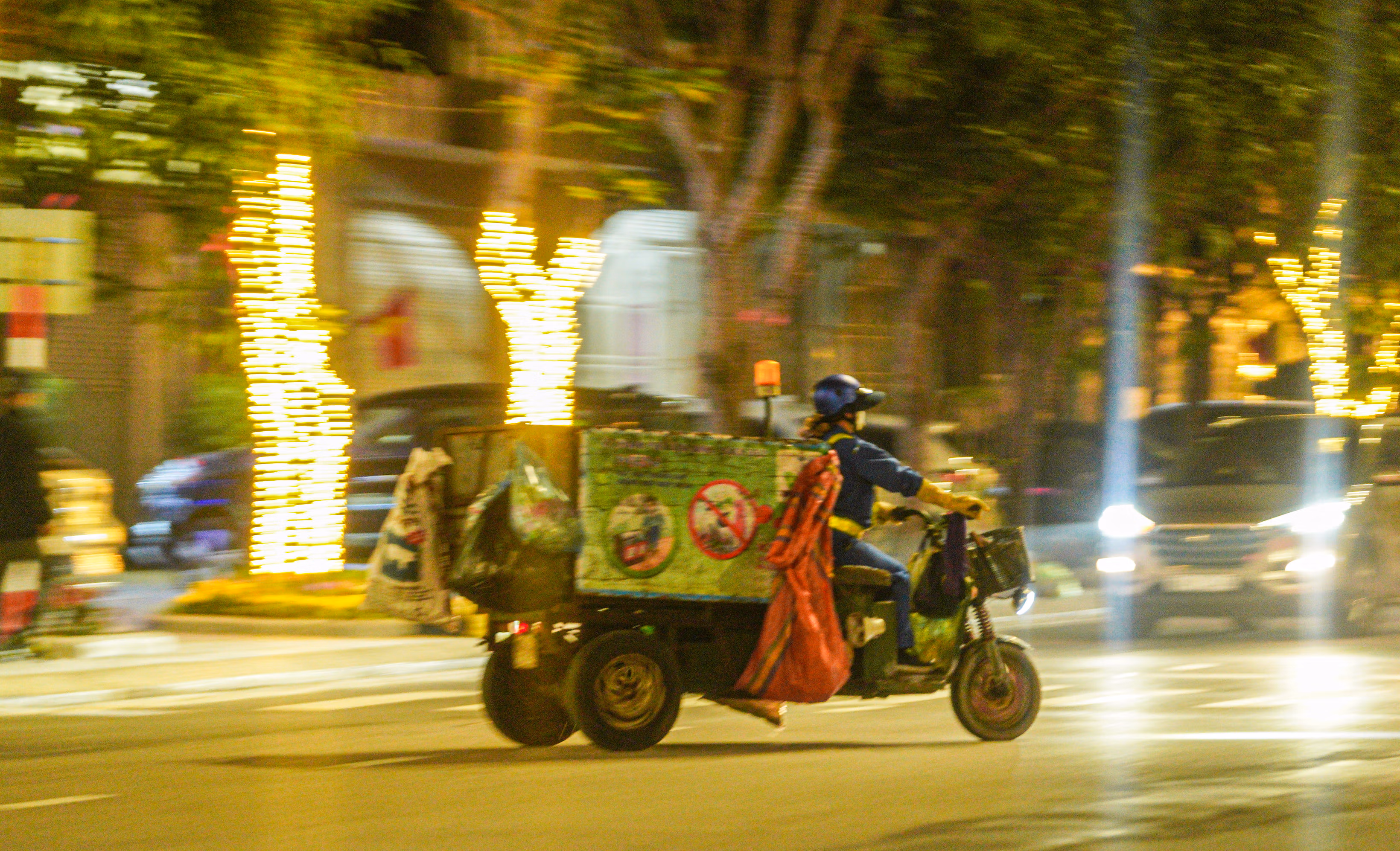 0 giờ. Pháo hoa bừng sáng trên bầu trời, tiếng đếm ngược vang lên từ quảng trường. Chị và đồng nghiệp dừng lại vài phút, ngẩng nhìn sắc màu rực rỡ, rồi tiếp tục công việc còn dang dở. Giao thừa của họ diễn ra dưới ánh đèn đường và bên cạnh xe rác, lặng lẽ nhưng thiêng liêng theo cách riêng.