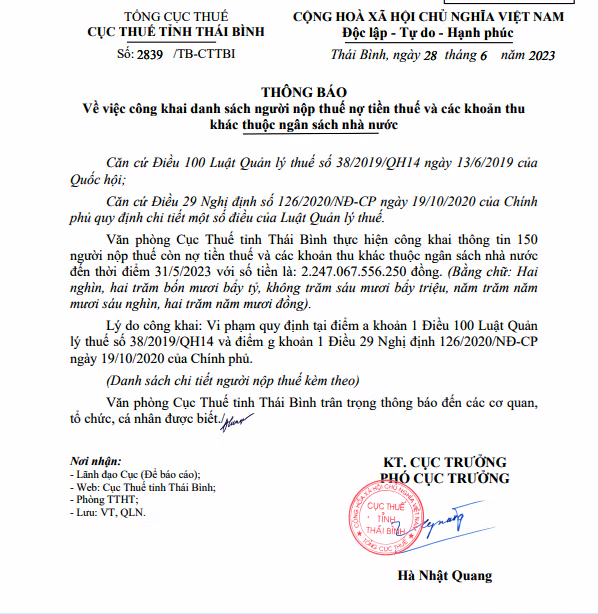 Ngày 3/7, thông tin từ Cục Thuế tỉnh Thái Bình cho biết, lãnh đạo Cục này vừa ký Thông báo của Cục công khai danh sách 150 tổ chức, doanh nghiệp, cá nhân do Văn phòng cục thuế quản lý còn nợ tiền thuế và các khoản thu khác thuộc ngân sách Nhà nước đến thời điểm 31/5, với số tiền hơn 2.247 tỷ đồng.