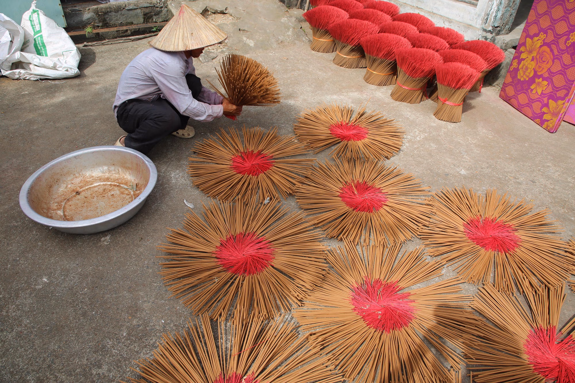 Tại cơ sở của bà Nguyễn Thị Tuyết (sinh năm 1973), một trong những hộ sản xuất quy mô lớn của làng, không khí làm việc vô cùng khẩn trương. Bà Tuyết chia sẻ, gia đình bà đã có nhiều đời gắn bó với nghiệp làm hương. Vào ngày thường, đơn hàng đều đặn nhưng khi bước vào vụ Tết, sản lượng tăng đột biến, gấp 3 đến 4 lần.