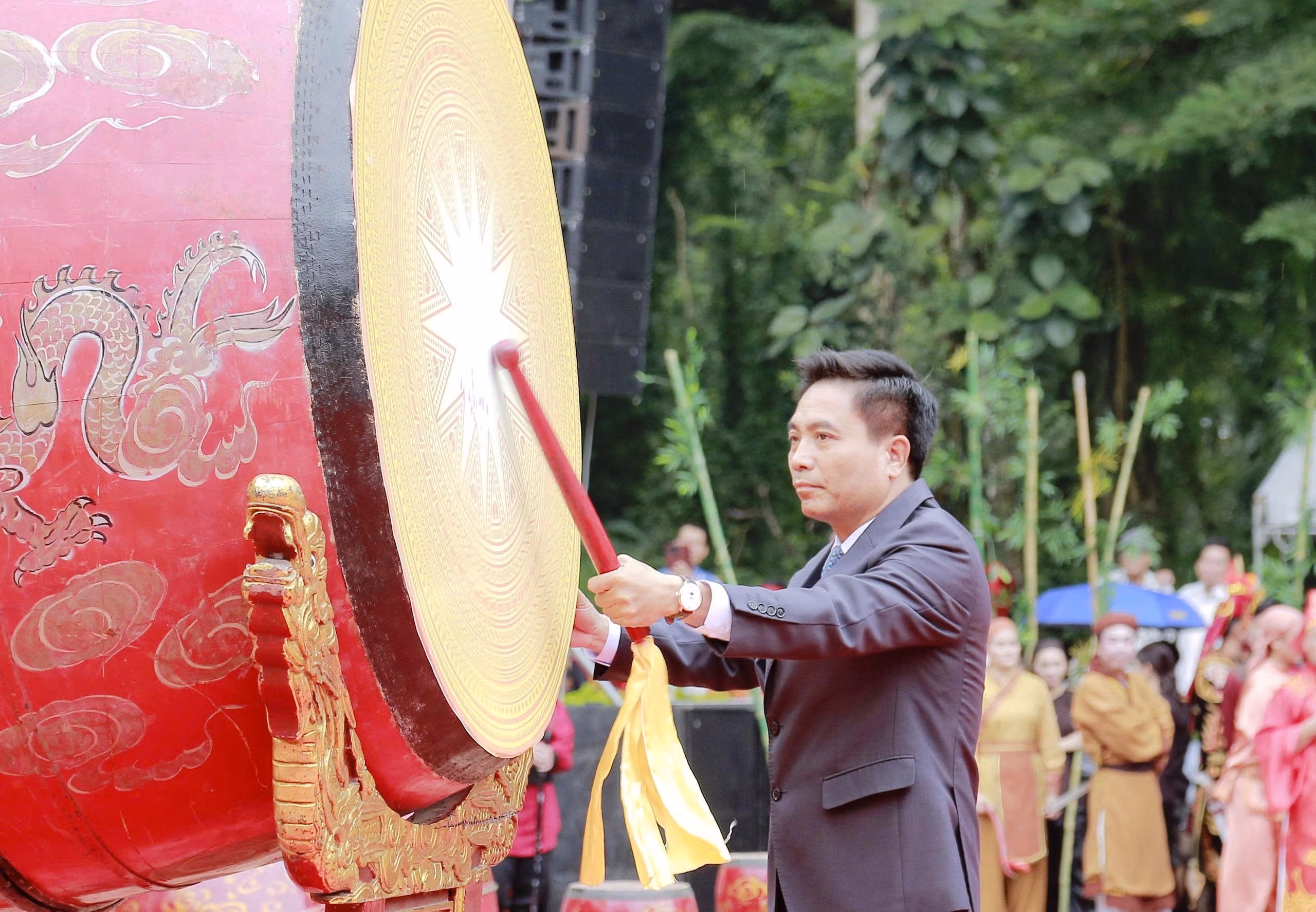 Trong không khí trang nghiêm, tưng bừng của lễ hội, ông Nguyễn Doãn Anh, Bí thư Tỉnh ủy đã đánh trống khai hội.
