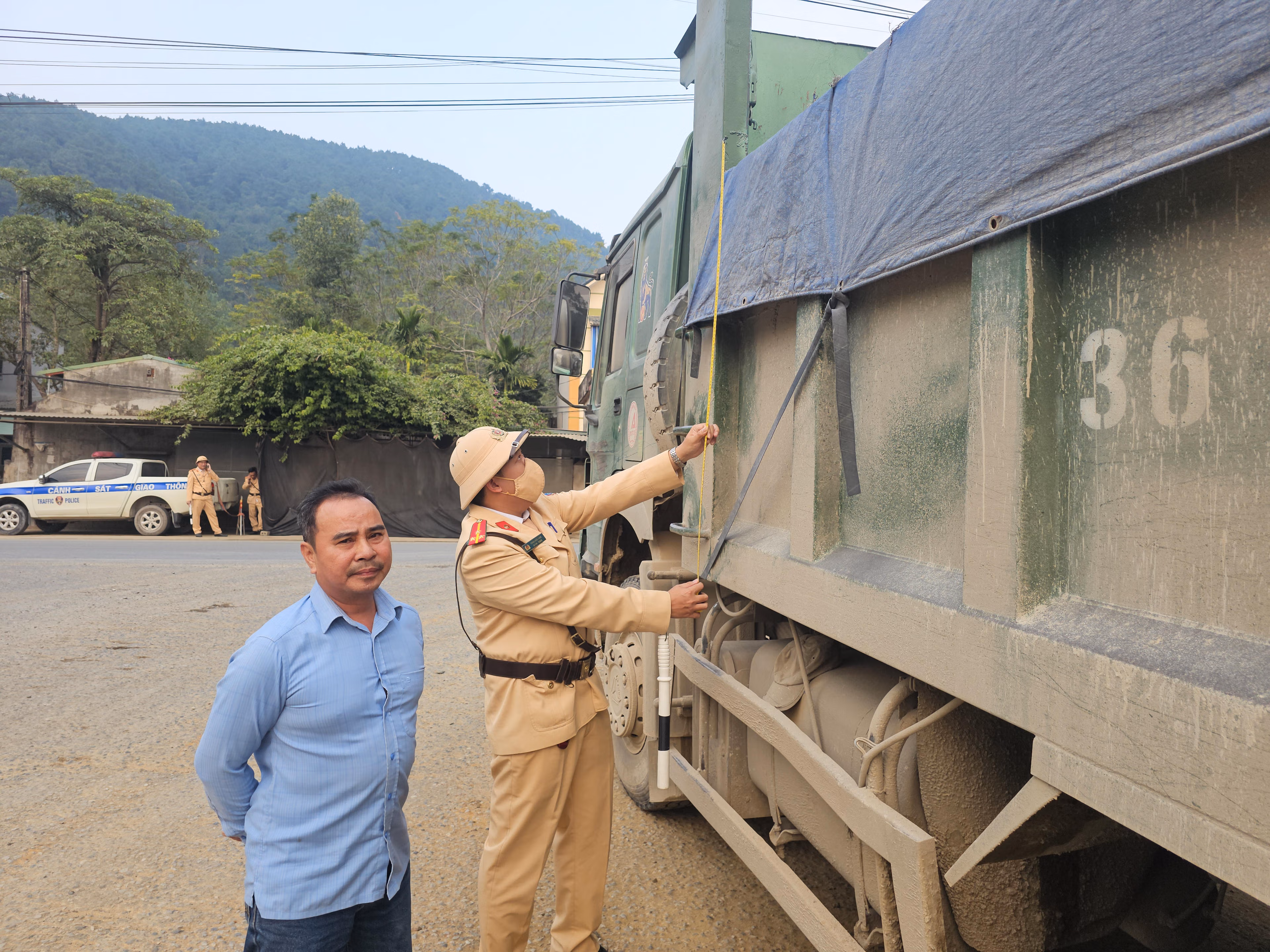 Chỉ trong khoảng 30 phút, phóng viên ghi nhận nhiều phương tiện chở khoáng sản bị lực lượng CSGT dừng xe kiểm tra giấy tờ, đo kích thước thành thùng, đồng thời đưa về trạm cân để kiểm tra tải trọng theo quy định.