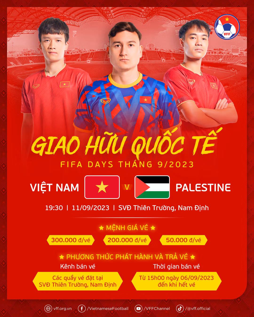 Chiều 6/9, Liên đoàn bóng đá Việt Nam thông báo kế hoạch bán vé trận giao hữu quốc tế giữa đội tuyển Việt Nam và đội tuyển Palestin, lúc 19h30 ngày 11/9/2023 trên sân vận động Thiên Trường - tỉnh Nam Định.