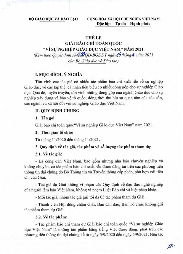 Thể lệ Giải báo chí toàn quốc “Vì sự nghiệp Giáo dục Việt Nam” năm 2021