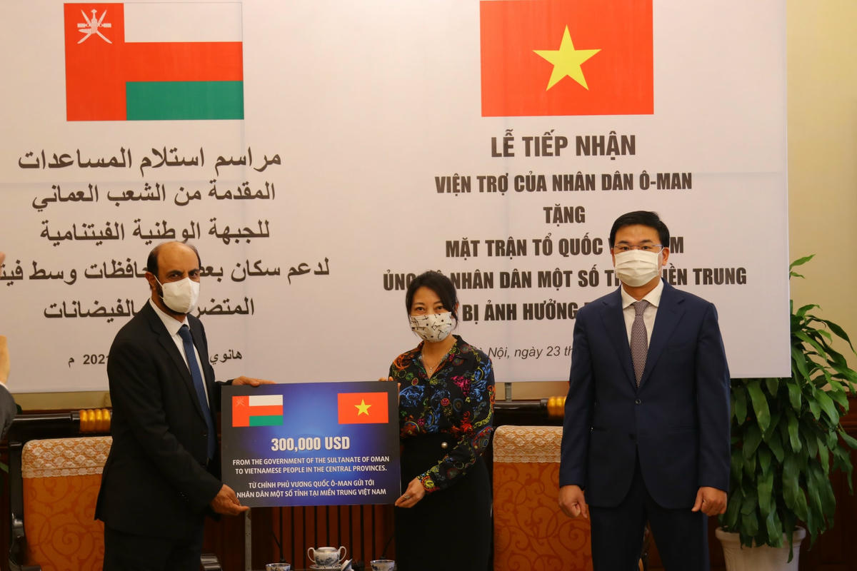 Ngày 23/9, tại trụ sở Bộ Ngoại Giao Việt Nam, UBTƯ MTTQ Việt Nam đã tiếp nhận khoản hỗ trợ trị giá 300.000 USD của Vương quốc Oman dành tặng cho nhân dân một số tỉnh miền Trung Việt Nam phòng ngừa và khắc phục hậu quả do bão lũ gây ra.