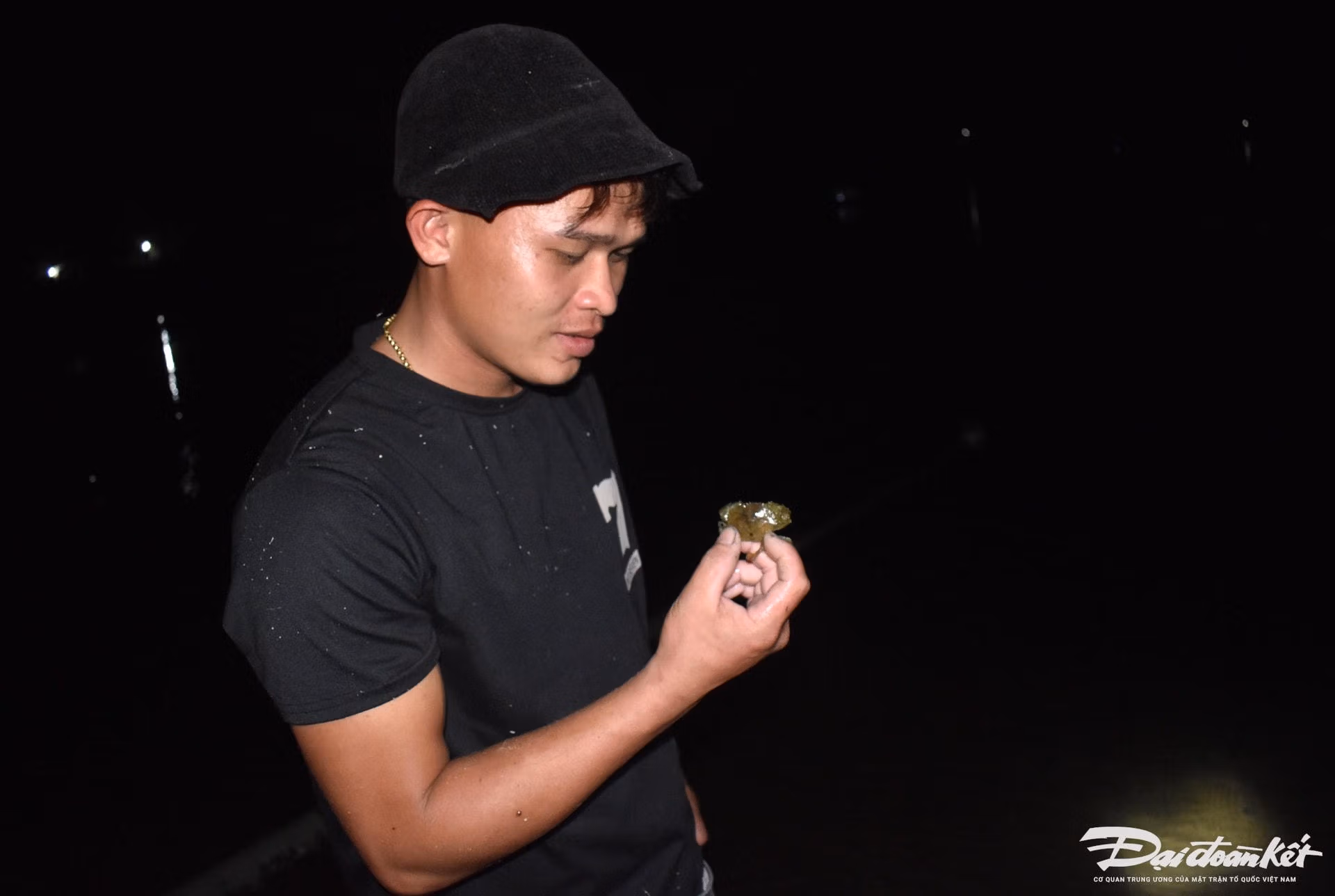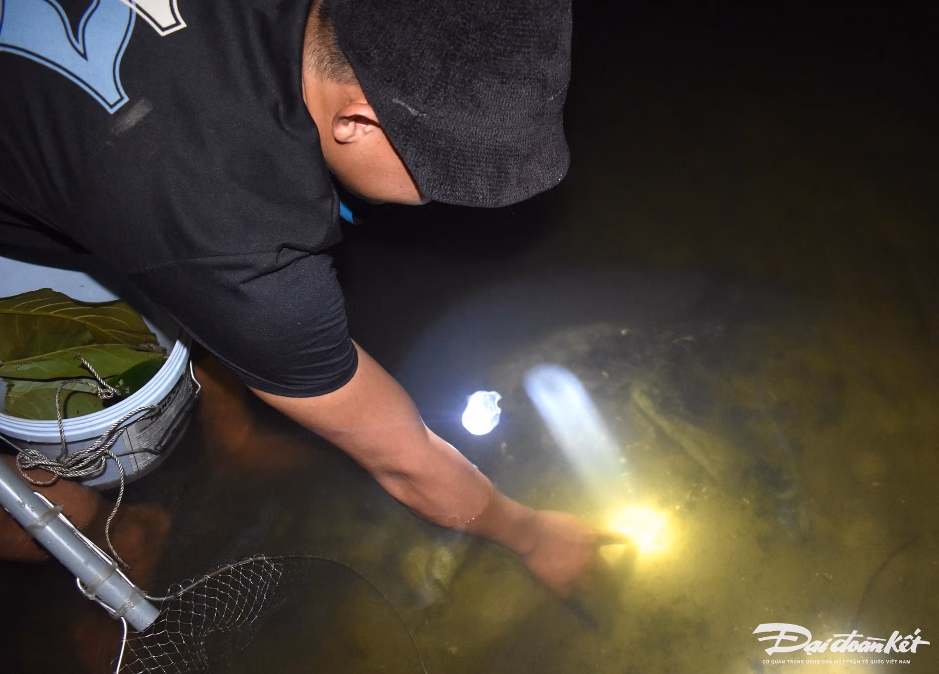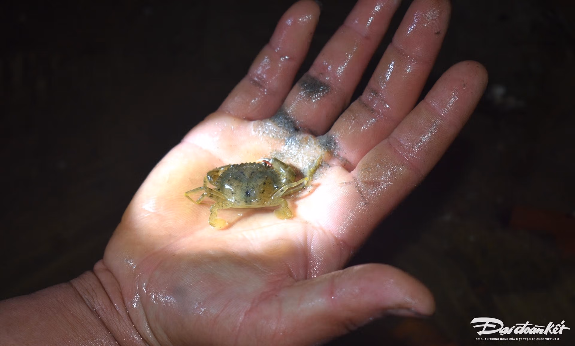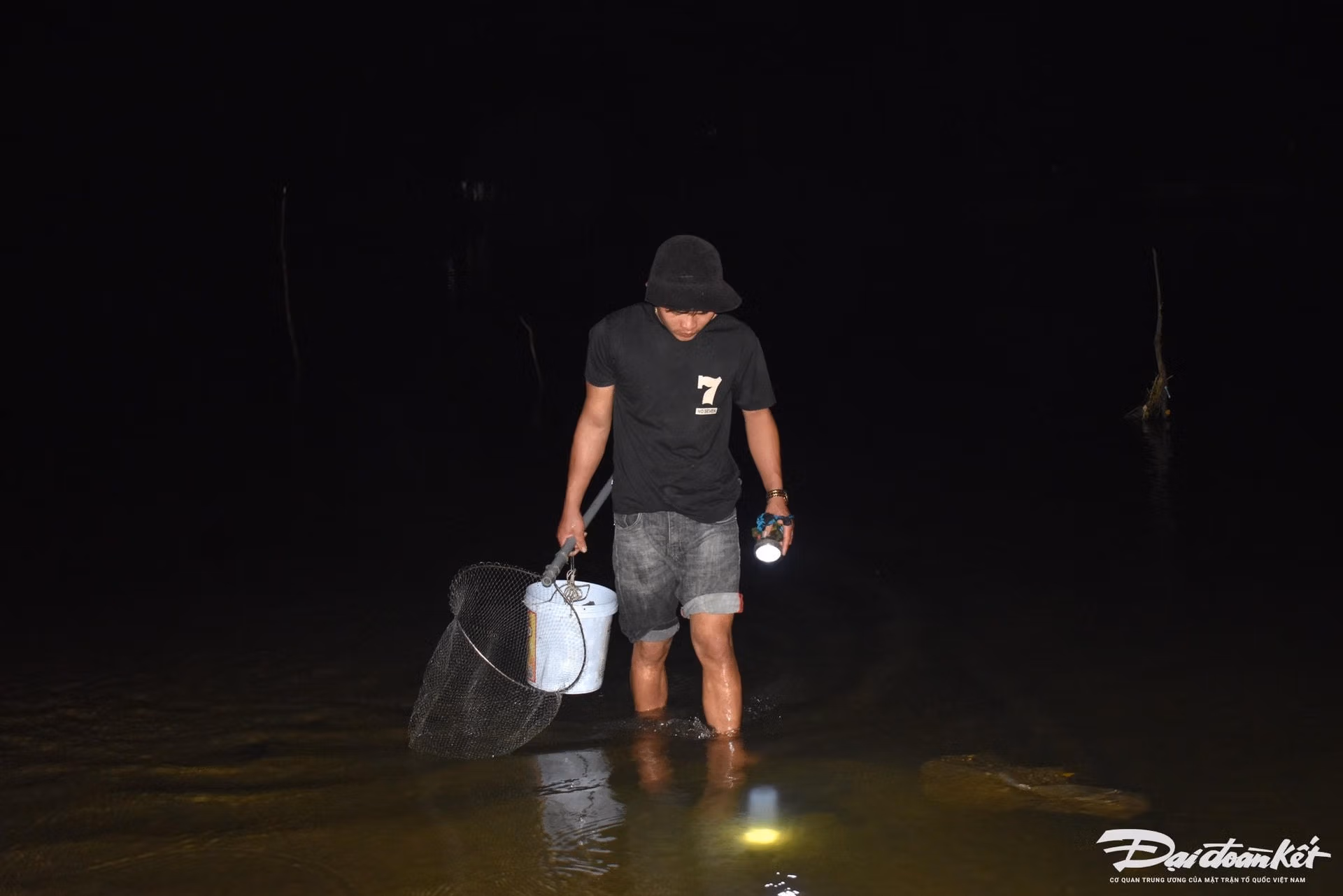 “Dụng cụ bắt cua khá đơn giản chỉ có chiếc vợt dài hơn 2m, cái xô nhựa, đèn pin. Cứ thế bì bõm dọc theo dòng sông, thi thoảng phát hiện ra những chú cua bò chìm dưới nước, chỉ cần đưa vợt ra là vớt được. Bắt được cua có cảm giác thú vị lắm, nhưng cũng có lúc sơ sẩy cua kẹp càng cắn rất đau”, anh Hảo vừa nói vừa cười.