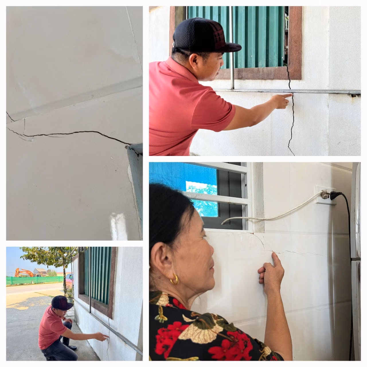 Cạnh nhà anh Xuân, căn nhà mới xây của gia đình ông Vương Văn Long (64 tuổi) cũng rơi vào cảnh tương tự. Theo ông Long, những vết nứt xuất hiện ngày càng nhiều, lan rộng, xé toạc cả lớp gạch ốp tường. “Nhà nứt nẻ khắp nơi, dầm nhà cũng bị gãy. Mỗi lúc máy lu ngoài công trình, ngồi trong nhà cũng cảm nhận được rung dưới chân. Cứ tình hình này thì sợ nó hỏng luôn từ dưới móng nhà” - ông Long xót xa.