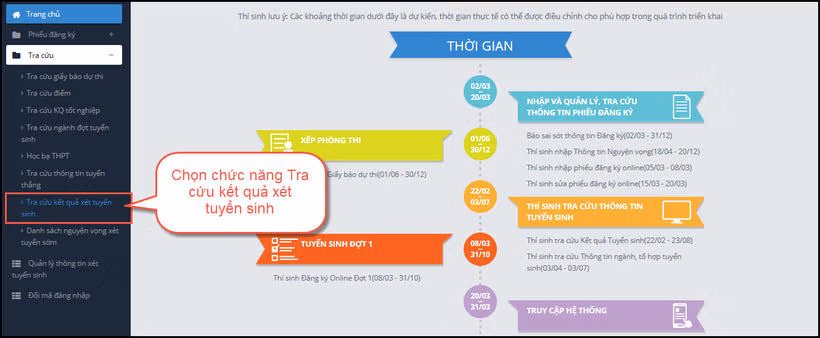 Bước 2: Vào menu Tra cứu kết quả xét tuyển sinh từ menu Tra cứu: