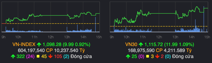 Sang phiên chiều, xu hướng tích cực gặp cản ở vùng quanh 1.100 điểm. Gần ngưỡng kháng cự mạnh, dòng tiền vào có phần thận trọng hơn. Tuy nhiên, áp lực chốt lời không đột biến giúp VN-Index nối dài chuỗi phiên tăng. Chốt phiên, chỉ số của sàn HoSE có thêm gần 10 điểm (0,92%), tăng lên gần 1.100 điểm. VN30-Index tăng gần 12 điểm (1,09%), đạt 1.115,72 điểm. Trên sàn Hà Nội, HNX-Index có thêm hơn 1%, còn UPCOM-Index tăng 0,7%.