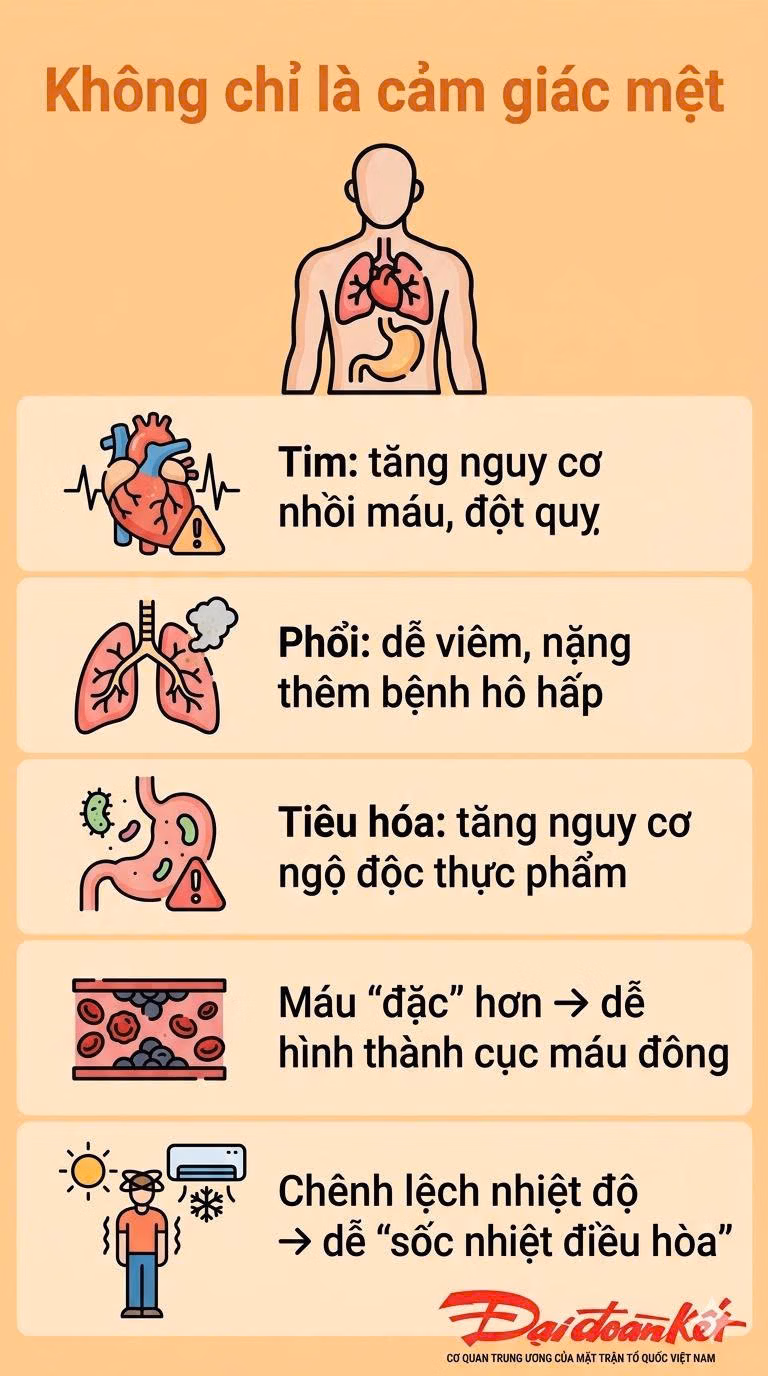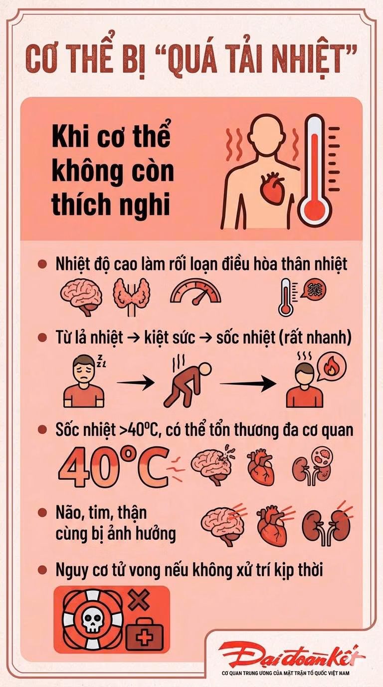 Thời tiết khắc nghiệt kéo dài: Đừng để kiệt sức do nóng Thứ Sáu 10/04/2026 15:15 (GMT+7) Nhiệt độ thực tế ngoài trời có thể cao hơn dự báo, kéo theo nguy cơ mất nước, sốc nhiệt và tổn thương đa cơ quan. Nhận diện sớm và phòng ngừa đúng cách là yếu tố sống còn. Đức Trân